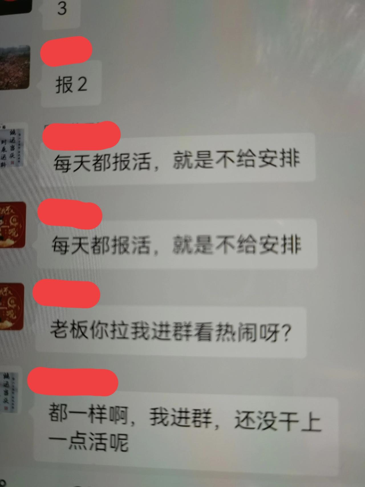 冬天岁末,好多工作都停了。靠出力挣钱的打工群体,在家闲不下来,为了养家糊口,纷纷自谋生路。 好在现在有了打工中介群,于是,打工一族怀着期盼,希望找份活干,挣点儿零花钱。 可是,挣钱的零活儿就那么些,找活儿干的人越来越多,这时候拼得就是手速了!每天群里通知一出,立马就开抢,像抢中奖彩票一样,手慢无啊! 有人几天都抢不到一份工作,中介群里一下热闹起来!发牢骚的、说脏话的,对着群主就是一通轰炸! 唉!都是为了生活啊!