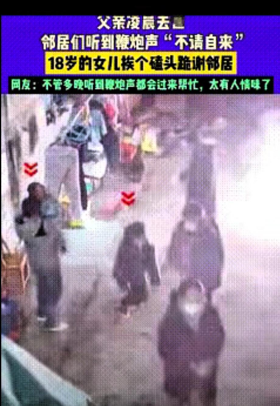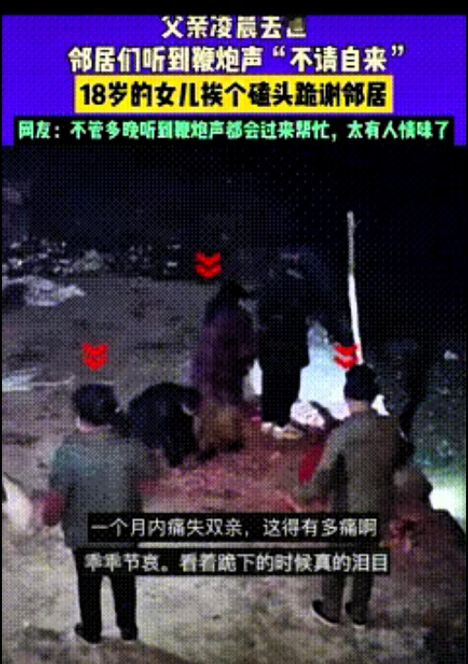 真的让人泪目! 一个月痛失两位双亲这得有多痛啊! 湖南1月3日凌晨两点,年仅18岁的女孩痛失父亲,按照乡俗,家里有人去世要放鞭炮,她独自在家门口燃放了鞭炮,这样邻居们听到后就知道发生了什么。 不大一会,邻居们纷纷拿着东西过来帮忙。 女孩见邻居们来了,接下来举动更让人心疼!挨个给邻居磕头,没落下一个人!而女孩的母亲在20天前刚病逝,现在又痛失父亲,18岁的孩子在一个月内痛失双亲,这心里得有多痛,别说是个孩子,成年人也难以承受的! 还好有善良的乡亲们帮忙料理后事,女孩的心情稍微好点。这些淳朴的邻居们让这个世界显得不那么冰冷,人间大爱,为乡亲们点赞! 好可怜的孩子!一个月痛失双亲!无助,无奈,无力啊!十八岁的年纪,担起一切责任!相信你以后要坚强面对生活!只要活着,就要努力!加油吧!