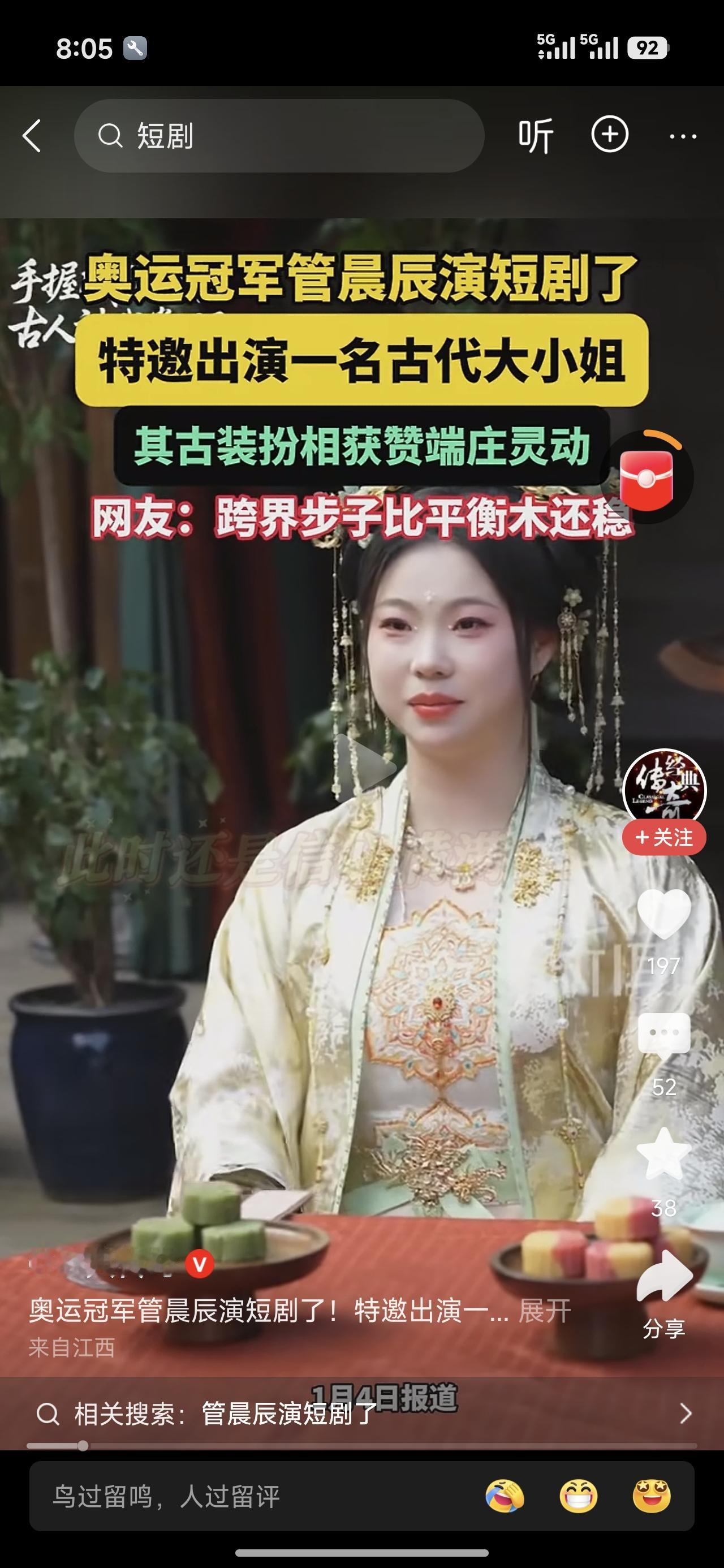 奥运冠军跨界演短剧,这波操作我服!奥运冠军退役不是当教练就是当教练,这会儿管晨辰给师弟师妹们打了个样儿。演个古代大小姐,别说有模有样儿。 胖墩墩儿的,是大小姐家里有银子,吃的还不错。也有人提了吴柳芳,吴柳芳要是演,应该更好看。你觉得呢?