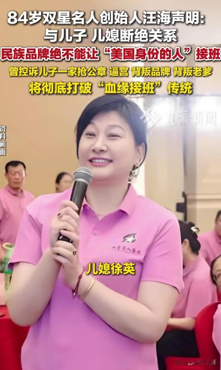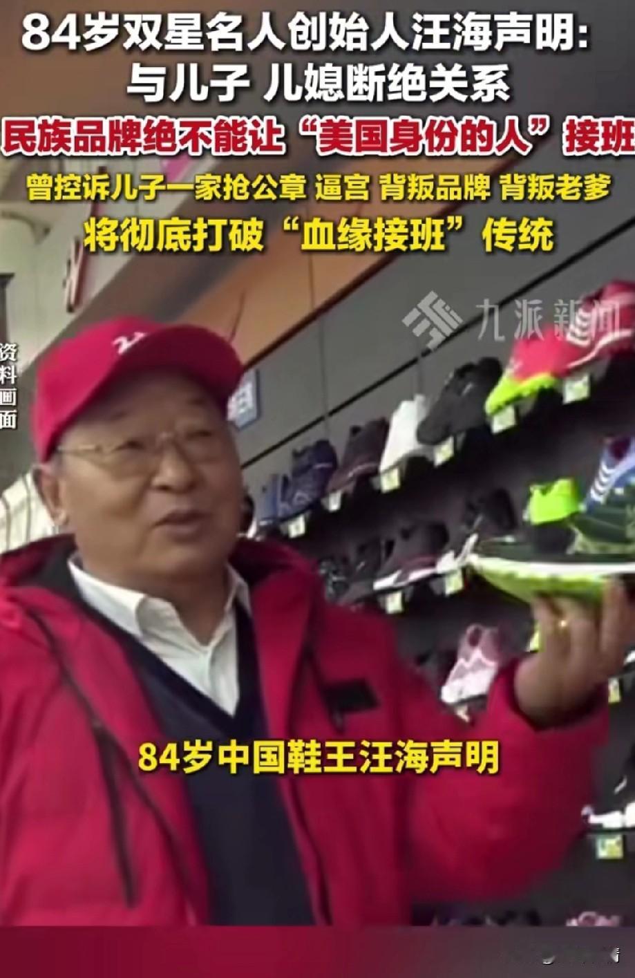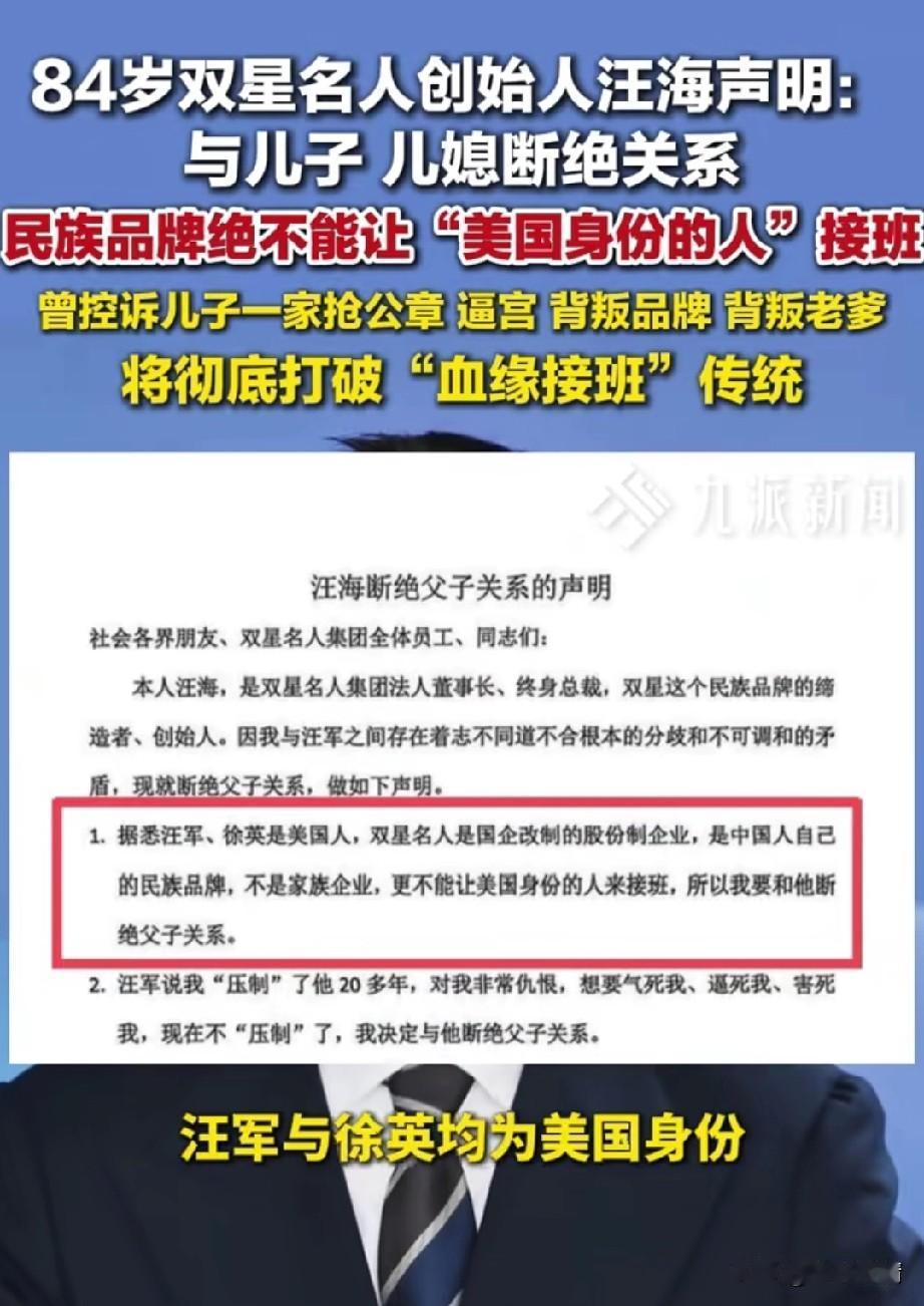 84岁双星名人创始人汪海声明,与儿子,儿媳断绝关系,声明中详细介绍了双星的历史, 明确了不让儿子汪军和儿媳徐英接手双星企业,他们两个人都是美国人,不能让民族品牌落入美国人之手, 这真的是大义灭亲,并且公开发声,儿媳撺掇儿子曾多次抢夺公章,而且还上演了逼宫的戏码。 这或许让双星创始人失去了对亲情的渴望,才明白二人为钱财迷了眼睛,如果让他们继承双星,那么很有可能将国货品牌送给美国! 这才不得不在媒体公开发声,不能让美国人接受双星的企业,他要彻底打破血缘关系,继承企业,转而投向职业经理人。 这场豪门恩怨以民族大义为先,可以说汪海背后有高人指点,民族大义一出,不管儿子儿媳有何招数,都会被舆论所唾弃,这不仅能够狠狠的宣传一波双星,而且还能让自己青史留名! 毕竟大义灭亲不是所有人都能做到的,双星创始人汪海在84岁高龄做出这个决定,确实非常的振奋人心,毕竟国货品牌不能交给美国人,不然双星的牌子算是毁了! 并且在声明里第3点详细介绍了,自己的儿子非常怨恨自己,自己压制了他20年,他急于摆脱父亲的压制,将双星纳入自己的手中,由此可以看出父子双方因为儿媳的关系剑拔弩张,到了彻底决裂的时候! 人人都想嫁入豪门,但人人又想家和万事兴,这根本不可能实现,所有豪门的家族历史已经告诉了人们答案,当非常有钱的时候,人就会被贪念所侵蚀,亲情都可能抛之不顾,这就是金钱的魔力! 不管双星创始人汪海出于什么目的,但是他的所作所为已证明了一切,那就是国货品牌大于天,更大于所谓的血缘关系,真正能将国货品牌留在国内的,也只有这条办法了! 大家对于双星创始人汪海大义灭亲这事怎么看? 汪海上海 汪董事长