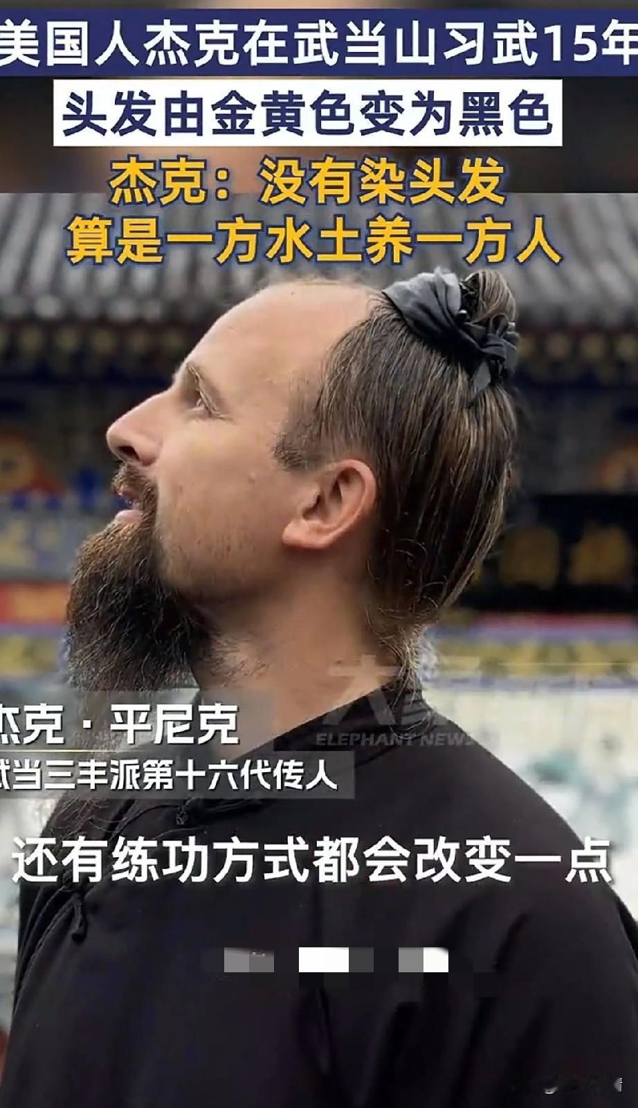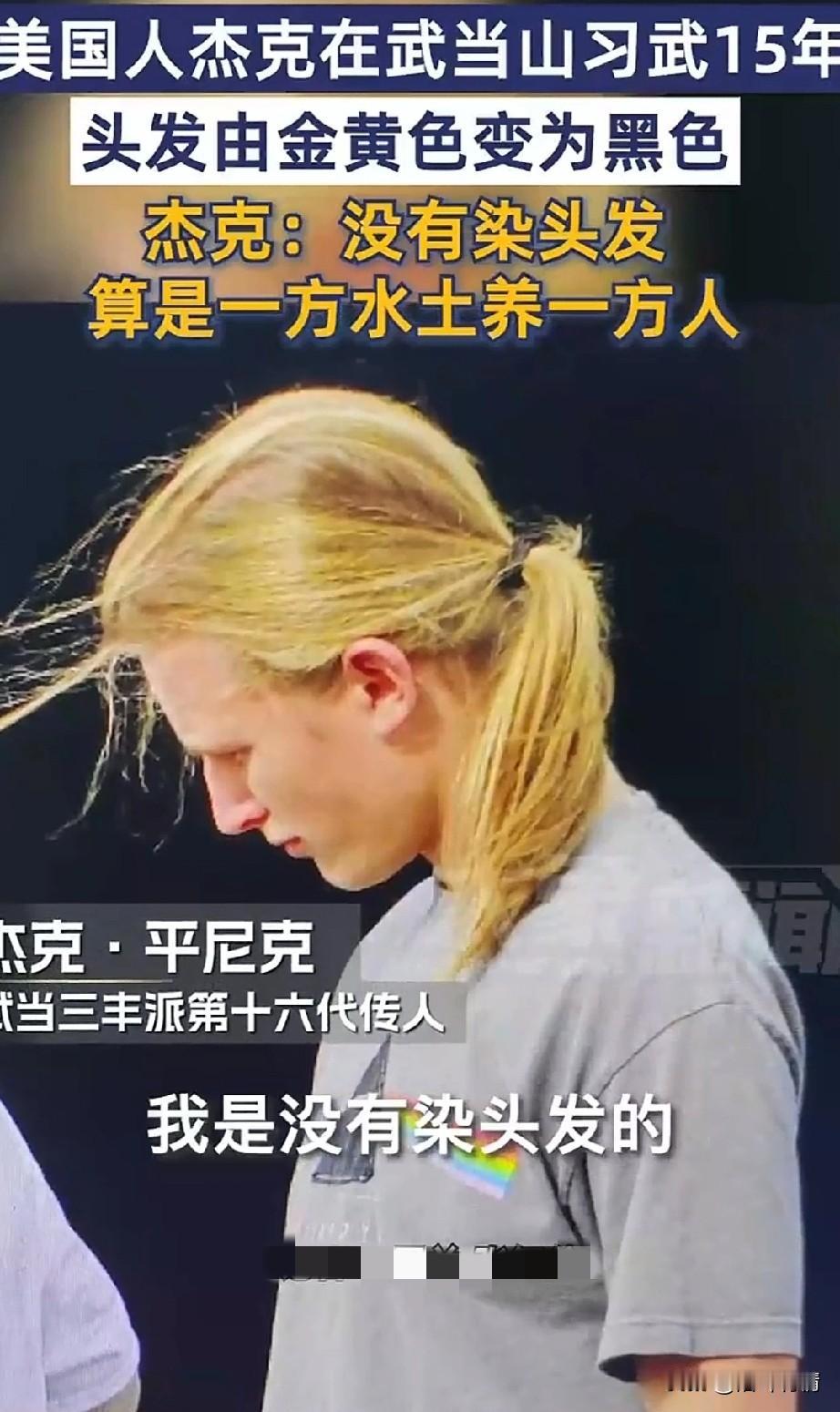 你敢相信武当张三丰派36代传人, 他居然是一个美国人, 这个美国人叫做杰克.平尼克, 这个杰克从小喜欢中华武术, 长大后不顾家人反对来到了中国武当山,终于实现了自己的武侠梦, 他在武当山学武整整15年, 这15年间他勤学苦练, 终于获得了掌门的青睐, 如今已经是第36代传人了, 他的汉语说的比中国人都地道, 最神奇的是他的头发由金黄色变成了黑色,他表示自己根本没有染发, 他的头发是自然变成了黑色, 他觉得是一方水土养一方人, 在中国的生活方式改变了他, 因此他的头发才变成了黑色, 如今的他穿着一身道袍, 猛一看还以为是中国的少数民族, 根本看不出来是美国人的样子, 想想以后偌大的武当, 掌门人居然是一名外国人, 真是有点儿不可思议, 难道中国武当派后继无人吗? 大家觉得杰克日后会接手武当派吗? 功夫 武当 张三丰武当派 张三丰祖师 张三丰旅游 外国人在武当