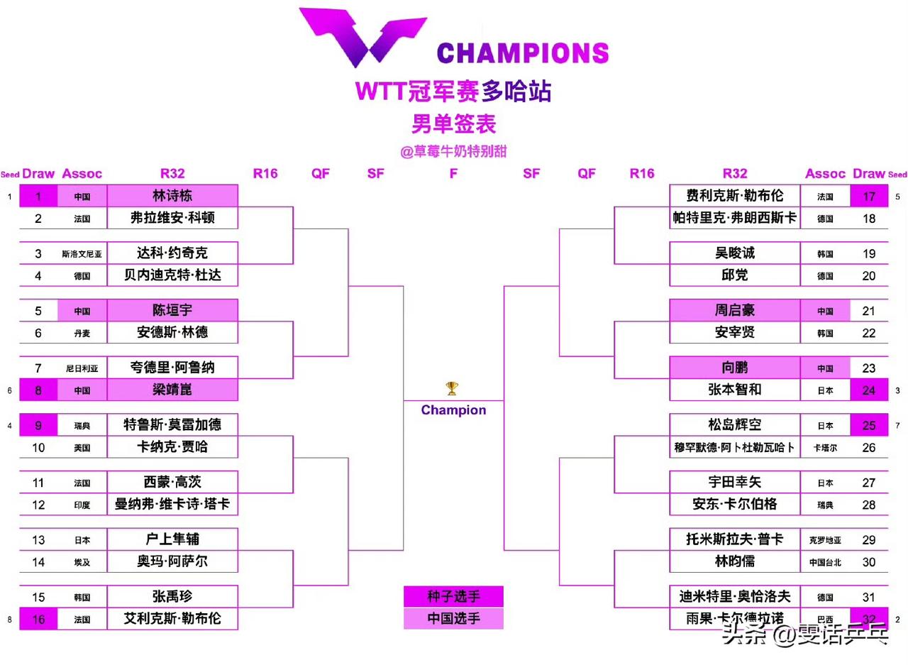 男单签表:1.5 【1/8区】林诗栋🇨🇳VS弗拉维安·科顿🇫🇷、达科·约奇克🇸🇮VS贝内迪克特·杜达🇩🇪 【2/8区】陈垣宇🇨🇳VS安德斯·林德🇩🇰、夸德里·阿鲁纳🇳🇬VS梁靖崑🇨🇳 【3/8区】特鲁斯·莫雷加德🇸🇪VS卡纳克·贾哈🇺🇸、西蒙·高茨🇫🇷VS曼纳弗·维卡诗·塔卡🇮🇳 【4/8区】户上隼辅🇯🇵VS奥玛·阿萨尔🇪🇬、张禹珍🇰🇷VS艾利克斯·勒布伦🇫🇷 【5/8区】费利克斯·勒布伦🇫🇷VS帕特里克·弗朗西斯卡🇩🇪、吴晙诚🇰🇷VS邱党🇩🇪 【6/8区】周启豪🇨🇳VS安宰贤🇰🇷、向鹏🇨🇳VS张本智和🇯🇵 【7/8区】松岛辉空🇯🇵VS穆罕默德·阿卜杜勒瓦哈卜🇶🇦、宇田幸矢🇯🇵VS安东·卡尔伯格🇸🇪 【8/8区】托米斯拉夫·普卡🇭🇷VS林昀儒(中国台北)、迪米特里·奥恰洛夫🇩🇪VS雨果·卡尔德拉诺🇧🇷