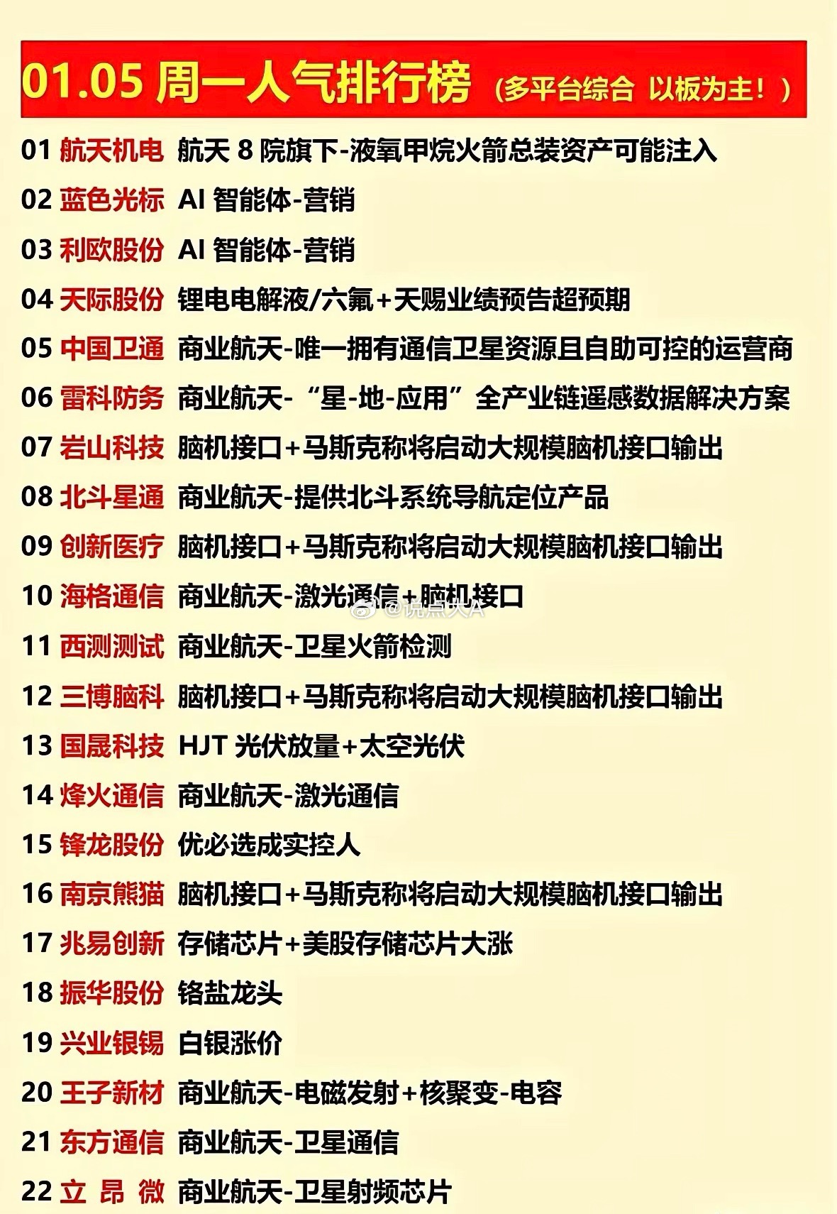 1.5周一人气排行榜梳理!今日市场的资金流向,热点高度聚焦在商业航天、AI智能体和脑机接口三大主线,同时存储芯片、贵金属等细分领域也有表现。这些标的都是当前最具政策催化、技术突破和市场想象力的方向,是短线情绪的核心载体。个股梳理分析1. 航天机电:作为航天8院旗下企业,因液氧甲烷火箭总装资产可能注入的预期成为榜首。这一资产注入预期带来了巨大的想象空间,是资金追捧的核心逻辑。2. 蓝色光标:AI智能体-营销领域的龙头,直接受益于AI技术在营销领域的商业化落地。其在数字营销的深厚布局,使其成为AI商业化进程中最受关注的标的之一。3. 利欧股份:与蓝色光标同属AI智能体-营销赛道,形成板块联动。公司在数字营销领域的积累,叠加AI赋能,成为资金挖掘的重点,享受行业发展红利。4. 天际股份:锂电电解液/六氟龙头,因天赐材料业绩预告超预期而受益。作为产业链相关标的,业绩预期改善带来的估值修复机会,吸引了资金的关注。5. 中国卫通:商业航天领域的核心资产,是唯一拥有通信卫星资源且自主可控的运营商。在商业航天大发展的背景下,其稀缺性和战略价值得到资金高度认可。6. 雷科防务:商业航天“星-地-应用”全产业链遥感数据解决方案提供商,覆盖卫星研发、数据应用等环节。其全产业链布局使其充分受益于商业航天的爆发。7. 岩山科技:脑机接口概念,因马斯克称将启动大规模脑机接口输出而受到热炒。作为前沿科技题材,短期情绪催化作用明显,是资金博弈的焦点。8. 北斗星通:商业航天领域提供北斗系统导航定位产品的核心企业,在卫星导航和位置服务领域技术领先。其受益于北斗系统的商业化应用和行业高景气。9. 创新医疗:脑机接口概念,与岩山科技形成板块联动。公司在医疗领域的布局叠加脑机接口的技术突破预期,成为资金追逐的情绪标的。10. 海格通信:商业航天+脑机接口双料概念股,涉及激光通信技术。其在卫星通信和高端通信设备领域的技术优势,使其成为多题材共振的核心标的。11. 西测测试:商业航天领域的卫星火箭检测服务商,为航天发射提供关键检测服务。作为商业航天产业链不可或缺的一环,直接受益于行业的高增长。12. 三博脑科:脑机接口概念,与马斯克的技术进展预期高度相关。作为神经外科和脑科学领域的细分龙头,成为脑机接口题材的核心标的。13. 国晟科技:HJT光伏放量+太空光伏概念,在光伏技术迭代和太空能源探索的双重催化下,成为资金挖掘的跨界题材标的,兼具技术想象空间。14. 烽火通信:商业航天领域的激光通信技术提供商,在光通信领域技术实力雄厚。作为卫星通信和地面通信网络的核心设备商,受益于航天通信需求增长。15. 锋龙股份:因优必选成实控人而受到关注,优必选作为人形机器人领域的领先企业,其入主带来了机器人产业链的想象空间,成为短期情绪标的。16. 南京熊猫:脑机接口概念,与马斯克的技术进展形成事件催化。公司在电子信息领域的技术积累,使其成为脑机接口题材的补涨标的。17. 兆易创新:存储芯片龙头,因美股存储芯片大涨而受益。作为国内存储芯片的核心企业,行业周期复苏和国产替代逻辑使其成为资金配置的重点。18. 振华股份:铬盐龙头,受益于行业供需格局改善,业绩预期向好。作为细分领域的龙头企业,其估值修复机会受到资金的持续关注。19. 兴业银锡:白银涨价受益标的,贵金属价格上涨带来业绩弹性。在通胀预期和避险情绪的影响下,白银资产的配置价值提升,吸引资金布局。20. 王子新材:商业航天-电磁发射+核聚变-电容概念,涉及前沿能源技术。作为资金挖掘的冷门题材标的,其技术想象空间巨大,成为短线情绪标的。21. 东方通信:商业航天-卫星通信概念,作为曾经的5G龙头,在卫星通信领域的布局使其成为商业航天题材的情绪标的。资金对其记忆性较强,容易形成联动。22. 立昂微:商业航天-卫星射频芯片提供商,在半导体射频芯片领域技术领先。作为卫星通信产业链的核心环节,直接受益于航天电子需求的增长。总结 今日市场热点呈现出高度集中、主线清晰的特征。商业航天、AI智能体、脑机接口三大方向成为资金的主战场,这些板块的龙头标的大多兼具基本面支撑和题材想象力,这既反映了市场对前沿科技的强烈预期,也体现了资金在存量博弈下抱团取暖的策略。对于短线交易者而言,这些主线和核心标的是观察市场情绪的关键窗口。本文涉及资讯、数据等内容来自网络公共信息,仅供参考,不构成投资建议!