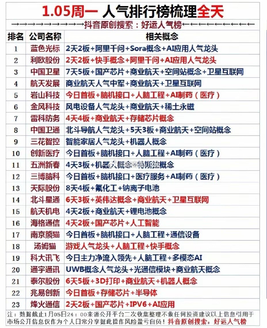 1月5号,A股热门人气股排行榜!!!蓝色光标2天2板,今天继续20cm涨停,AI应用人气龙头,后市值得高看一眼;利欧股份2天2板,快手概念叠加AI应用人气龙头,后市值得期待;三博脑科20cm一字板涨停,脑机接口龙头概念,后市值得高看!!!