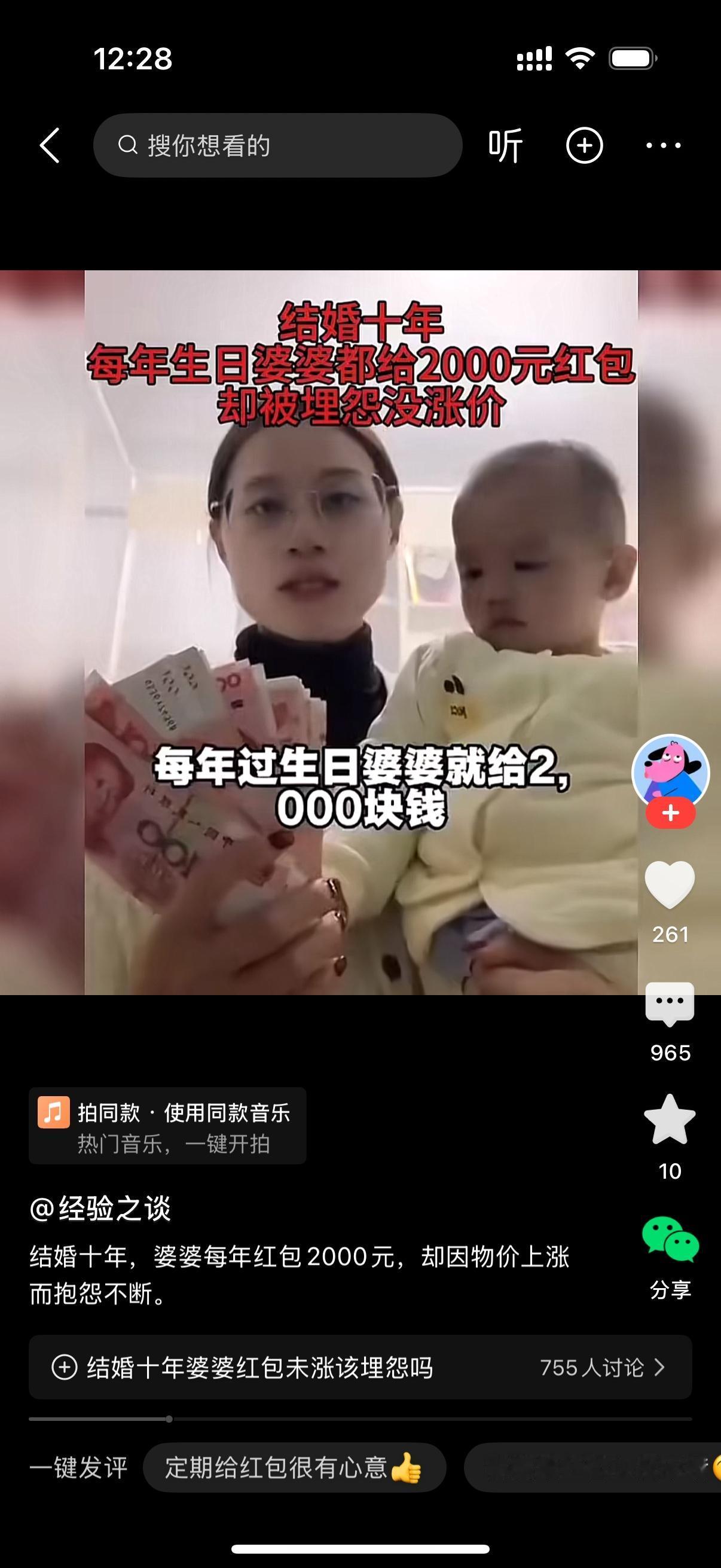 儿媳妇在网上吐槽,结婚十年,婆婆每年就给自己2000块钱,红包从来就没有涨过。她问网友们,你们过生日,婆婆都给多少呀。很明显这个儿媳对婆婆的做法很不满,她希望红包能年年涨。这就是人心不足蛇吞象,你作为儿媳又给老人包过多大的红包呢?包过没?