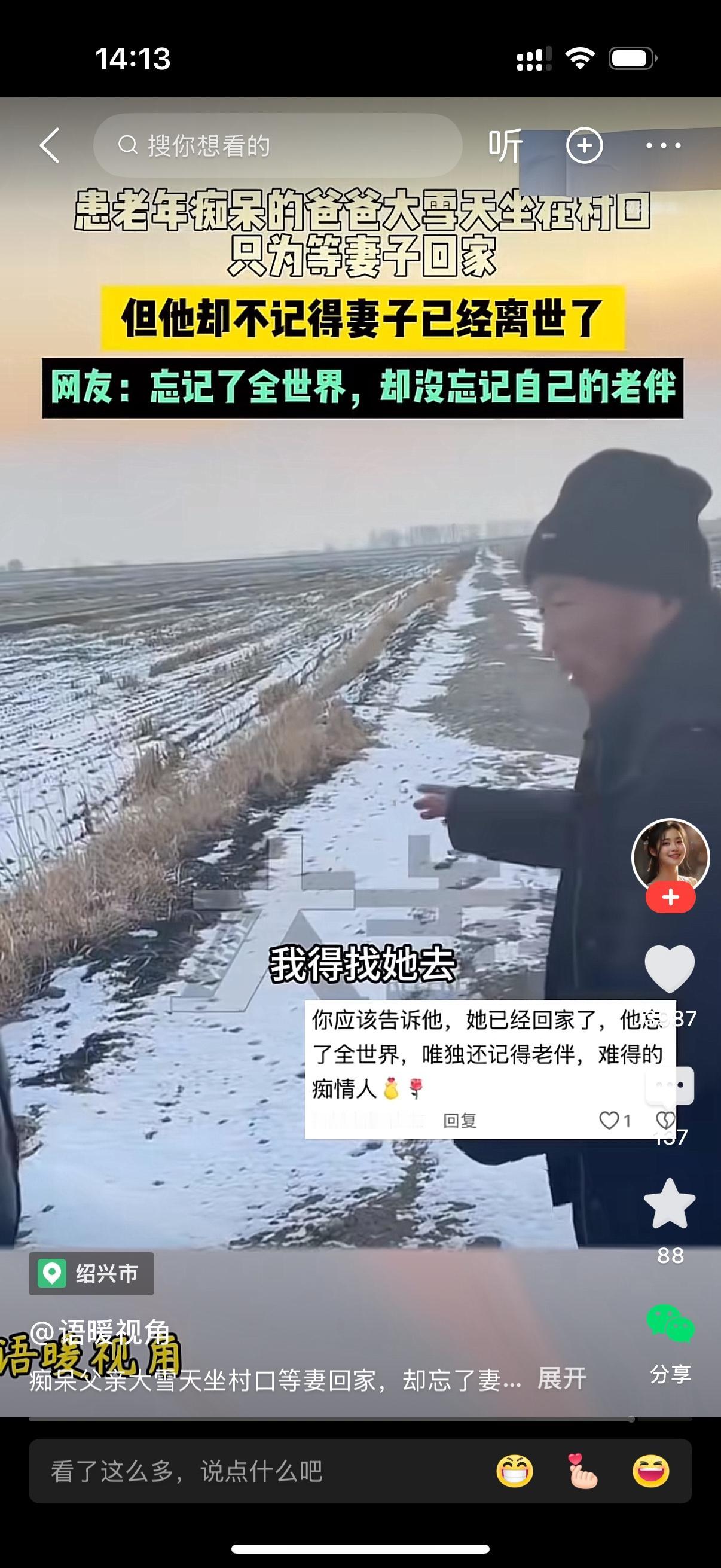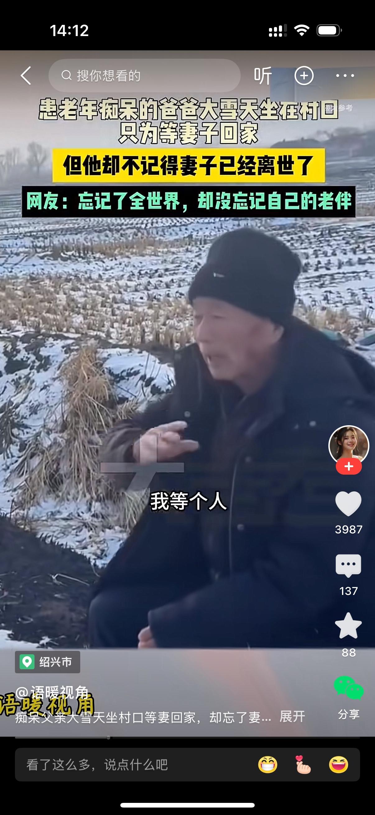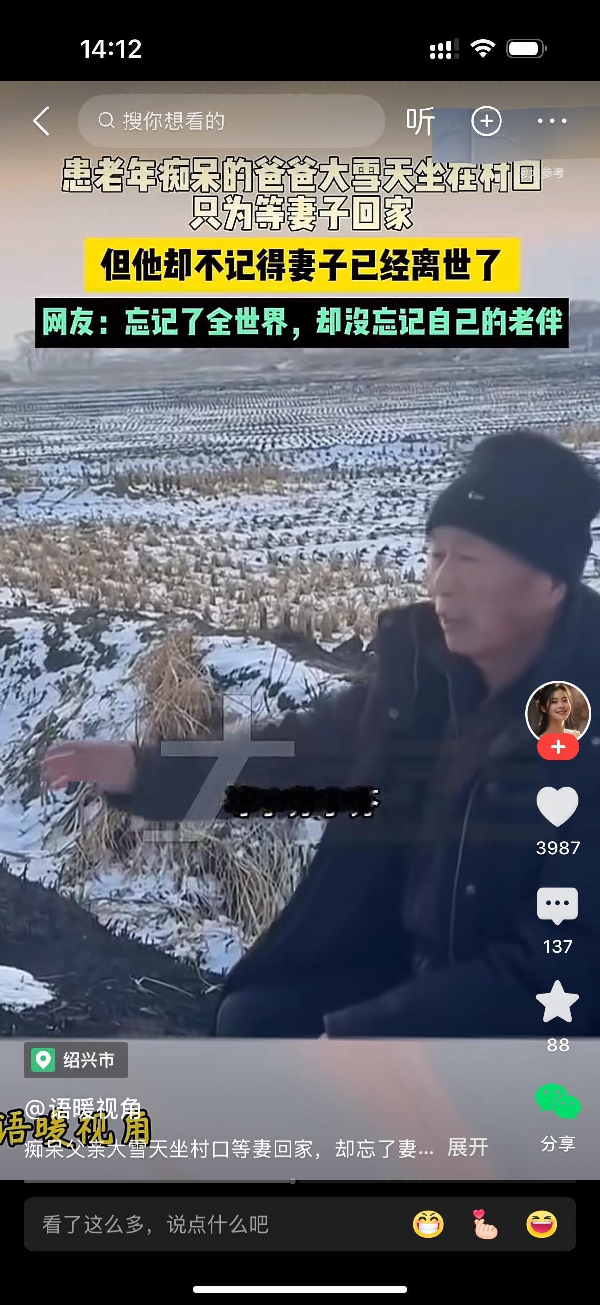 老年痴呆的父亲大雪天坐在村口。儿子费了老鼻子力才找到他。儿子埋怨父亲大冷天在这前不着村后不着店的地方干啥呢?爸爸说,我等小芬。儿子说小芬是他妈,去世已经多年了。儿子搀扶着老爸回去。父亲却不愿意,继续往村外走,说小芬还没回来,我得找她去。老父亲忘记了全世界,唯独没忘掉自己的老伴,让人泪崩。愿天下所有老人都能一起相伴终老。