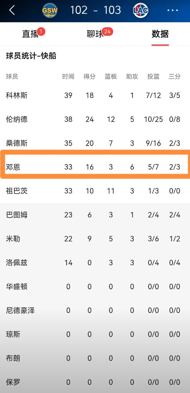 全场比赛下来,邓恩首发出战33分钟,投篮7中5,其中三分球3中2、罚球4中4得到16分3篮板6助攻1抢断。