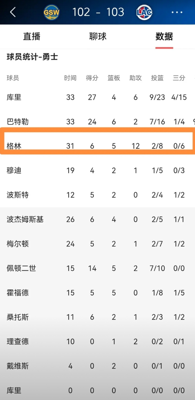 整场比赛下来,追梦格林首发出战31分钟,投篮8中2,其中三分球6中0、罚球2中2非常低效的得到6分。