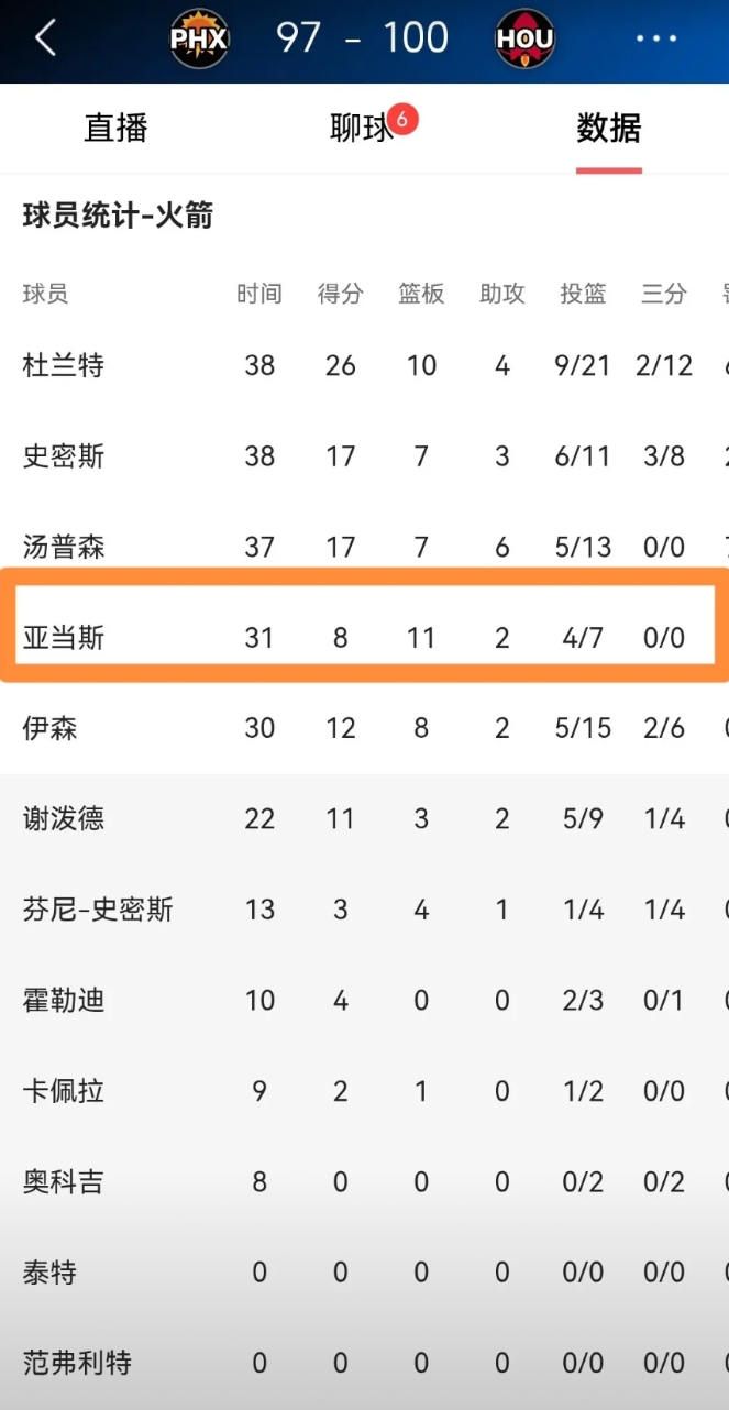 火箭老将亚当斯真是太反常了!在今天火箭主场以100:97险胜太阳的比赛中,向来不喜欢得分的老将亚当斯却一反常态,他竟然出手了7次。