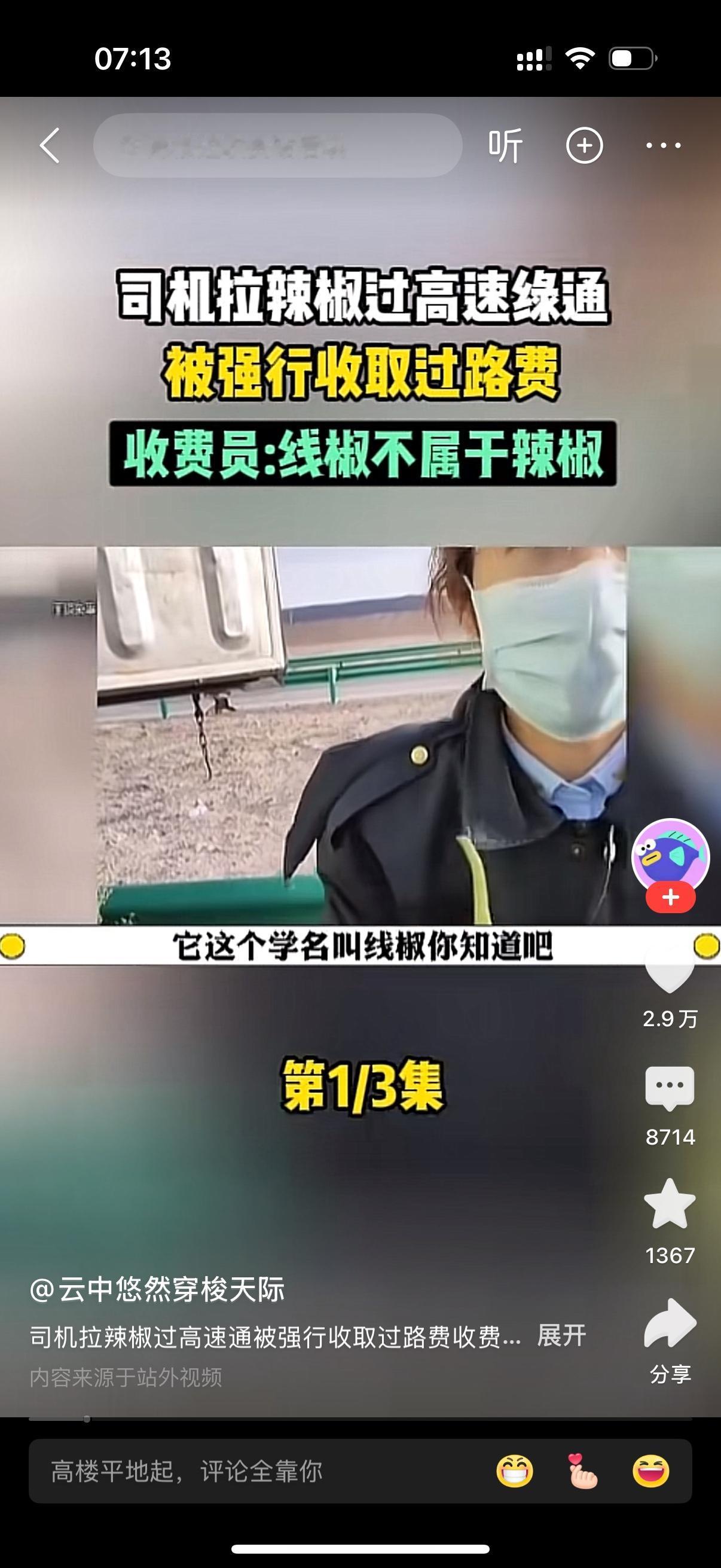 司机拉线椒过高速绿通,收费员说线椒不是辣椒 ,要强行收取高速过路费。司机问,线椒不也是辣椒吗?收费员一本正经地解释,线椒是线椒,辣椒是辣椒,名字不一样。线椒不在鲜活农产品目录里。司机百思也不得其解,线椒怎么就不是辣椒呢?辣椒可以免通,线椒就不行?而且别的收费口都是免费绿通的。可这个收费人员就认死理,坚持认为目录里没有线椒这个品类,一定要收费。哎,真是没一点生活常识。