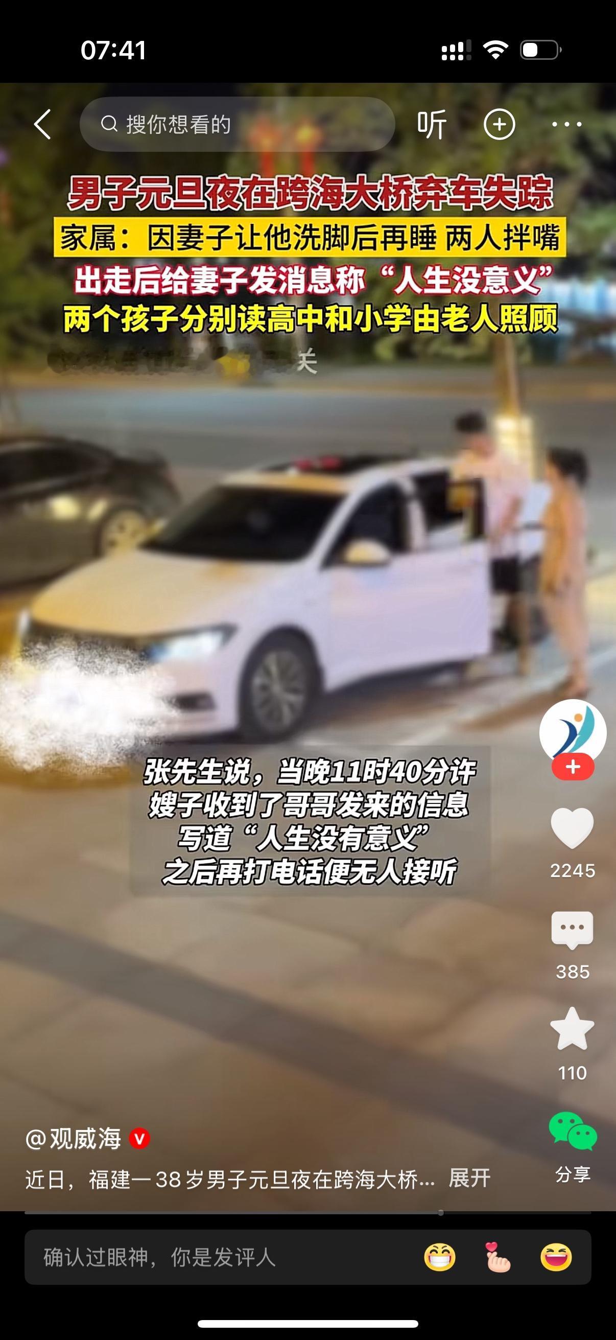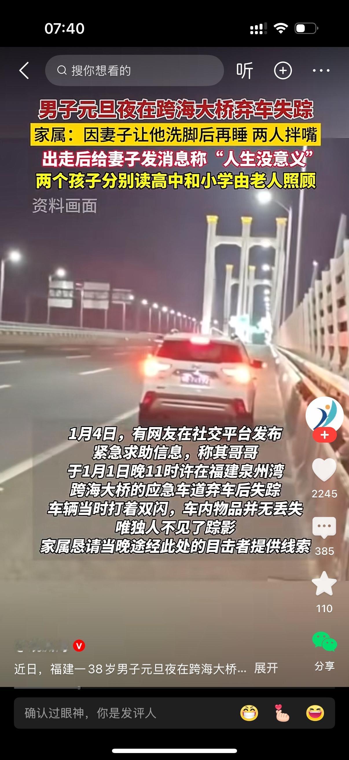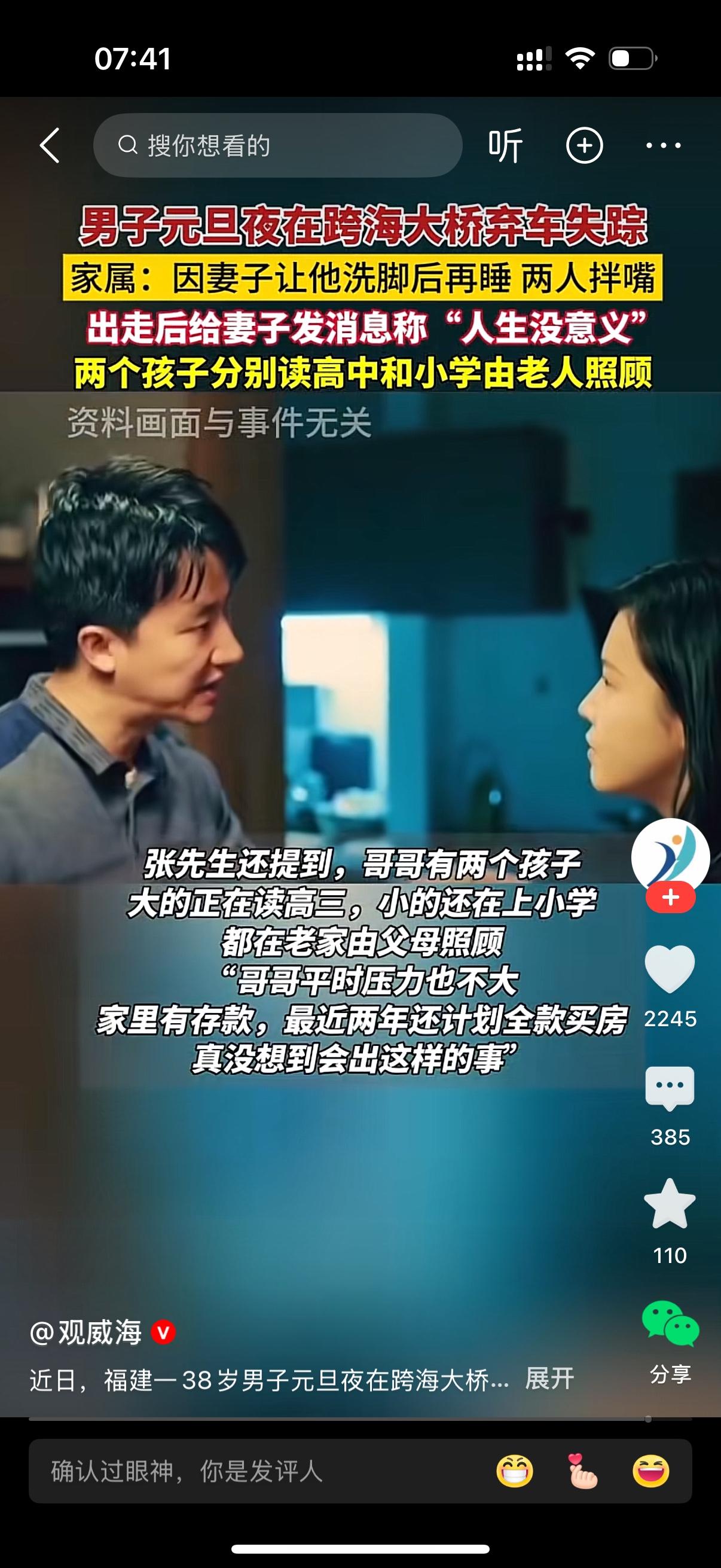 男子在跨海大桥弃车失踪。家属称起因就因为妻子让他洗脚后再睡,两人拌嘴。男人离家出走,给妻子发了一条信息,说人生没有意义。妻子给他打电话,无人接听。女人是真过分,不洗就不洗,有什么大不了。男人真是太脆弱,不洗就不洗,走什么极端?哎,洗脚这点事就让人崩溃,太不可思议了。