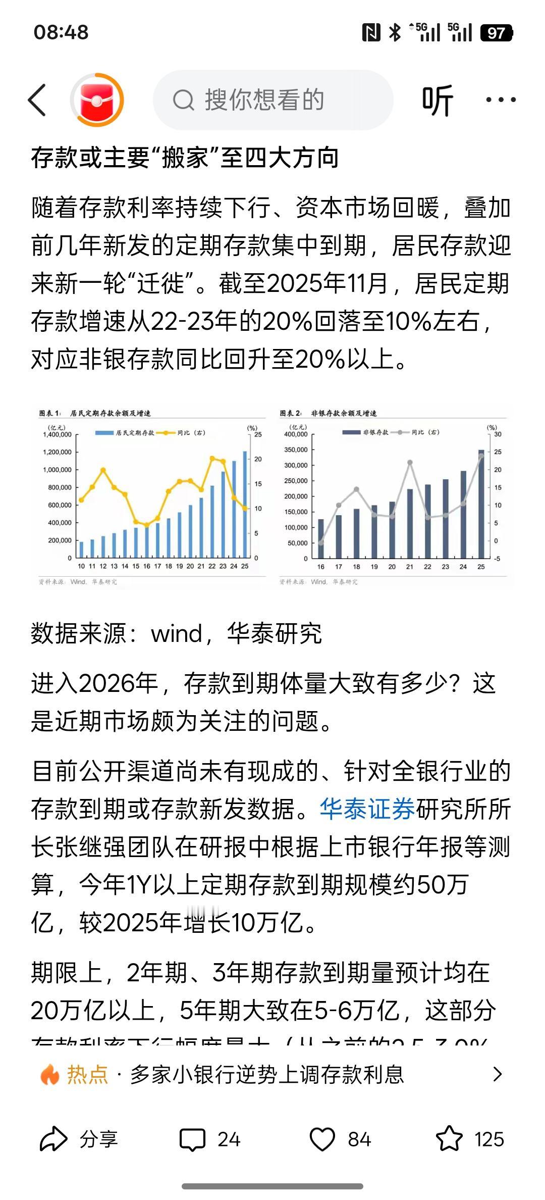 这是利好消息,50万亿存款“洪流”将至,四大去向引关注,谁能接住这场“活水”?几十万亿的存款将流向哪里?至少上半年有200000亿的存款要到期,而且现在银行大额存款已经停止销售,那么这些钱到期的话自然会选择地方进行投资,要么选择银行的低利率存款,要么选择金融资本市场流入股,要么买基金,要么买债券,要么进入实体行业进行投资,但是会有绝大部分资金通过买基金或者买相关投资理财产品,至少在金融资本市场大概率是会有资金参与! 根据去年的开户人群的数量越来越多,而且持续在增量!居民存款储蓄也将会有大部分流入金融资本市场