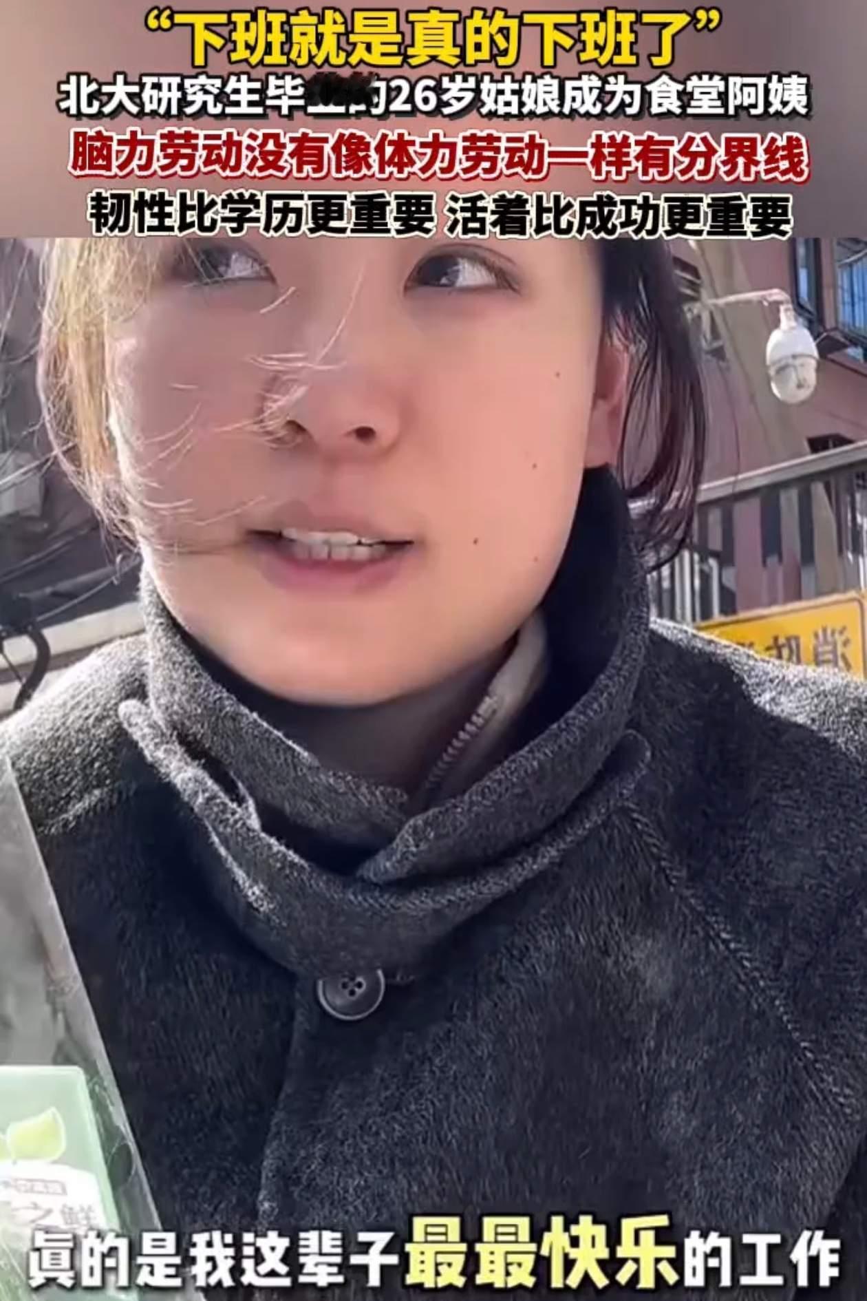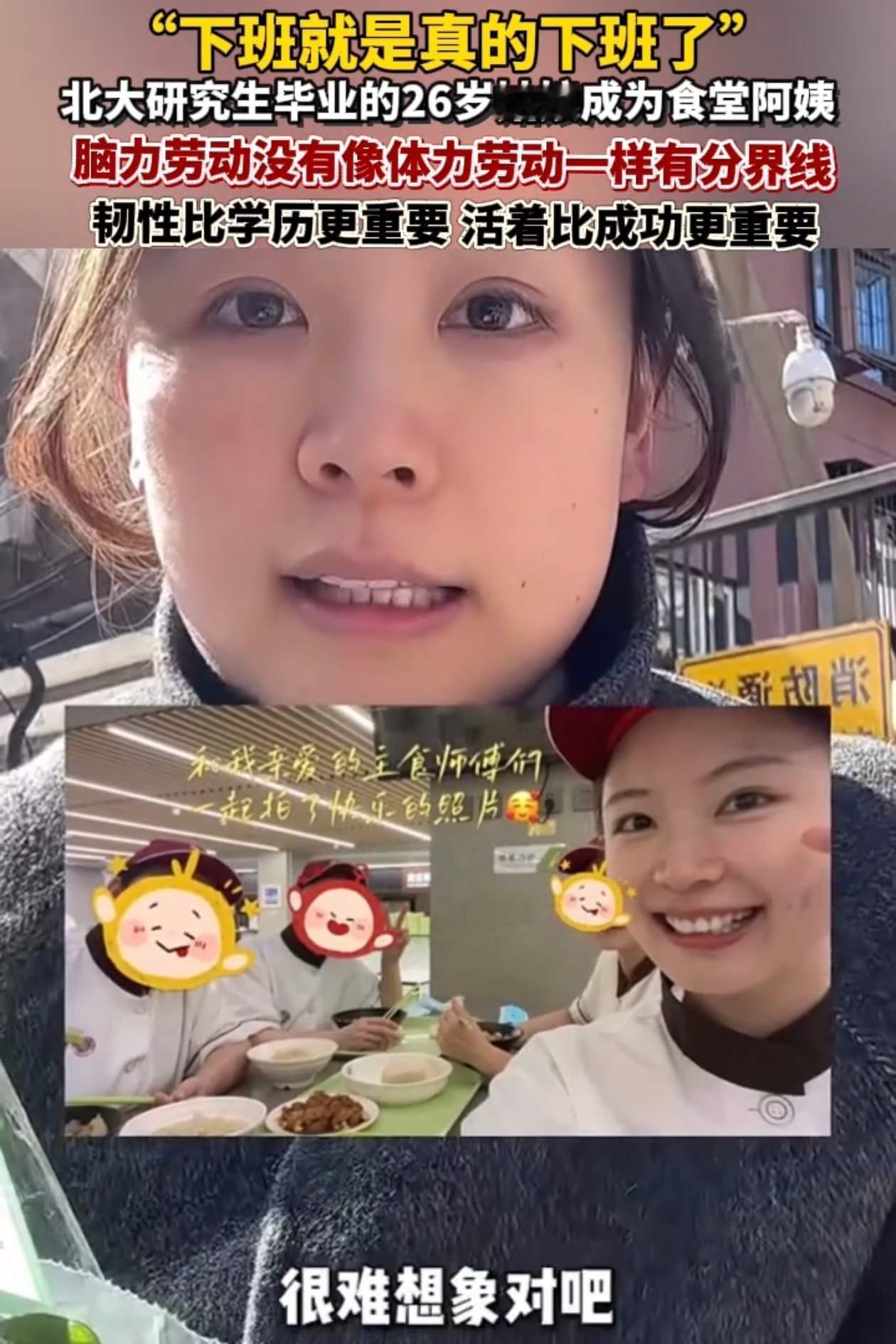 北京一位26岁的北大女研究生毕业之后放弃了高薪工作,选择留在学校做食堂打饭阿姨,父母得知之后直接崩溃,明确表示反对,但是当他们看到女儿脸上久违的笑容之后,又突然不说话了。 当一个人终于决定打破“理所当然”的枷锁,迎面而来的,可能不是掌声,而是质疑、是眼光,是不解。尤其来自最亲密的人——父母的担忧、失望,像沉甸甸的石头,压在心头。可是,为什么会有人坚持走自己想走的路?他们到底在追求什么?是那份所谓的“安稳”与“面子”,还是那份内心深处的渴望与自由? 你是否也曾在生活的十字路口徘徊?曾经被“应该”绑架,被“未来”焦虑折磨,却在某个瞬间,发现真正让你心跳加速的,从不是那些金光闪闪的职位,而是那一份纯粹的快乐——像姑娘在食堂那样,手握勺子,笑得无比轻松自在。 其实,这个世界从来不缺“成功”的定义。有人说,进大厂、拿高薪才是人生赢家;有人说,稳定踏实才是正道。但你可曾想过?人生的真谛,不是别人的标准,而是你自己心里的那份满足感。那份笑容,才是最好的答案。 姑娘的选择让我们看到:勇敢做自己,或许会被质疑、被误解,但也会迎来真正的自由与幸福。她用行动告诉所有人:不要让别人的眼光定义你的未来。不要为了所谓的“面子”放弃内心那份最纯粹的渴望。 每个人都值得拥有属于自己的光彩,不是吗?你是否也在某个角落,隐约感受到那份久违的喜悦?或许,下一次的决定,就从听从自己内心那份微弱却坚定的声音开始。 也许,你会被质疑,会被不理解,但请记住,幸福,从不需要别人的认同。它只属于那些勇敢追寻自己心之所向的人。像姑娘一样,用行动打破固有的框架,用微笑面对质疑,用心去体会那份属于自己的轻松与快乐。 所以,别让“应该”成为你的枷锁。人生,最美的风景,永远在你的选择之外。你准备好,去追寻那份真正属于你的幸福了吗?