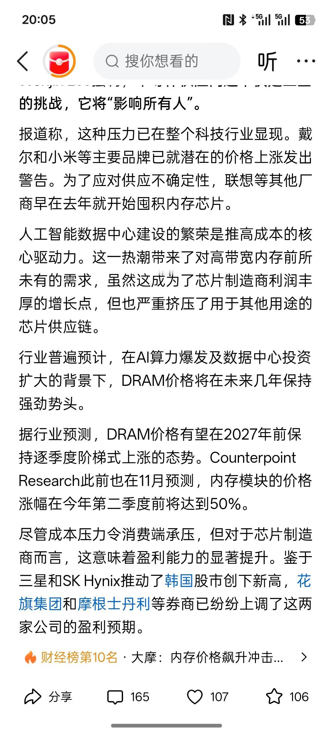 涨吧,继续涨吧,三星警告:内存成本飙升,所有电子产品面临涨价,现在半导体供应链将影响到所有人,甚至全球各大企业,英伟达现在也下场,要直接抢购手机内存,根据华尔街机构的预测,2026年存储芯片的价格还会上涨80%!AI人工智能的发展确实吸收了太多的存储芯片!接下来的算力中心建设数据中心建设还需要更多的存储芯片,包括内存条!那未来整个消费电子产品行业都将迎来价格上涨!而且有些题还不一定拿得到货!芯片短缺的问题,短时间内还解决不了! 现在一套内存条直接涨到50000块,后续可能还会涨,供不应求的货,那未来手机市场的内存条也要紧张! AI人工智能的发展以及生态的建设会吸收更多的存储芯片内存条