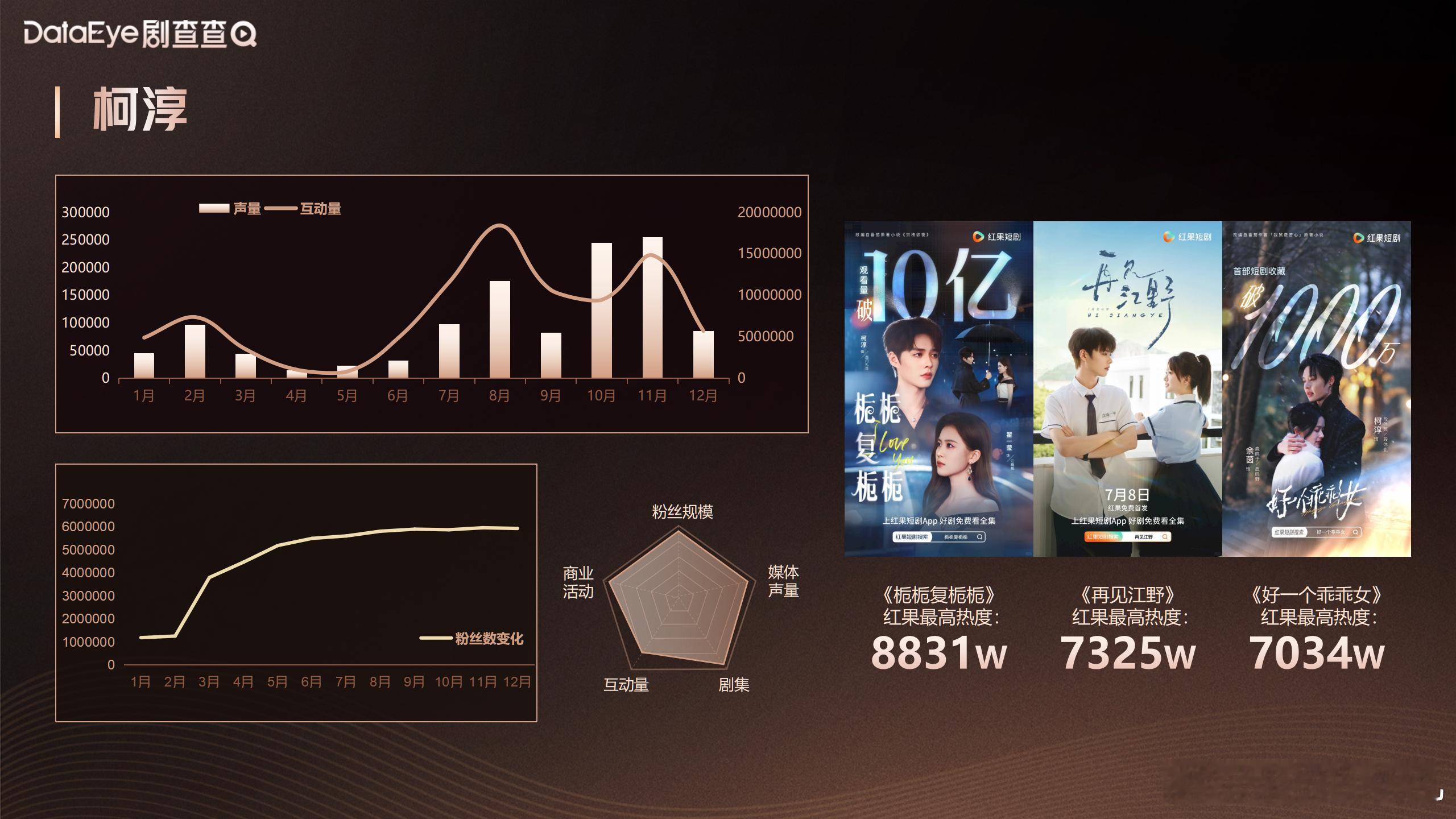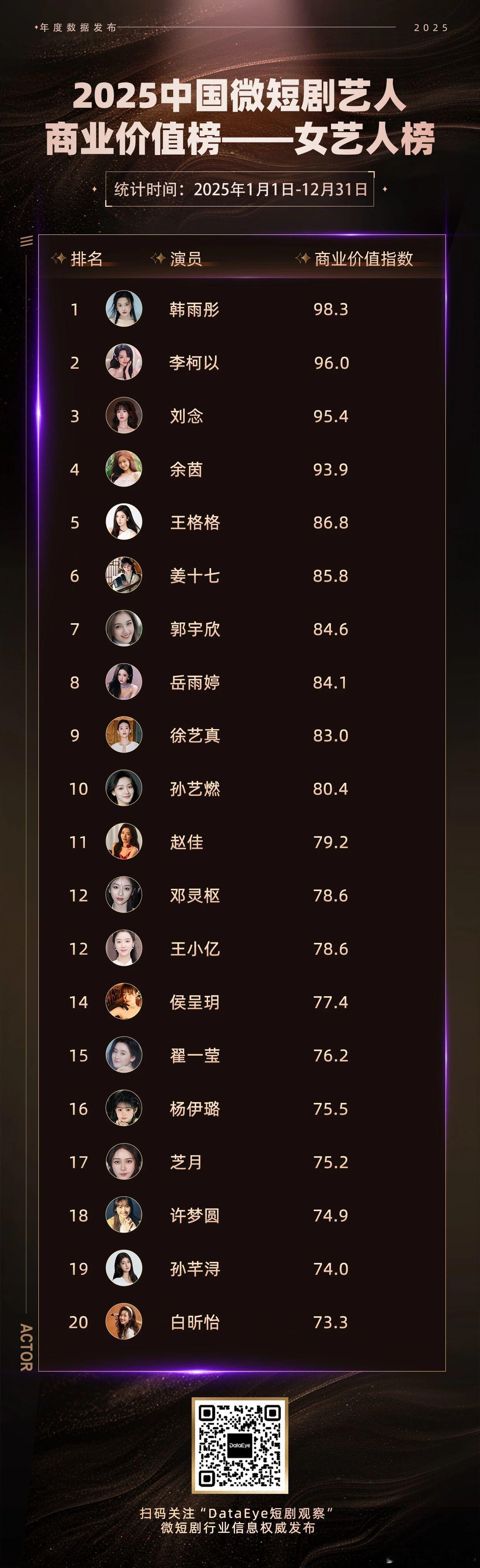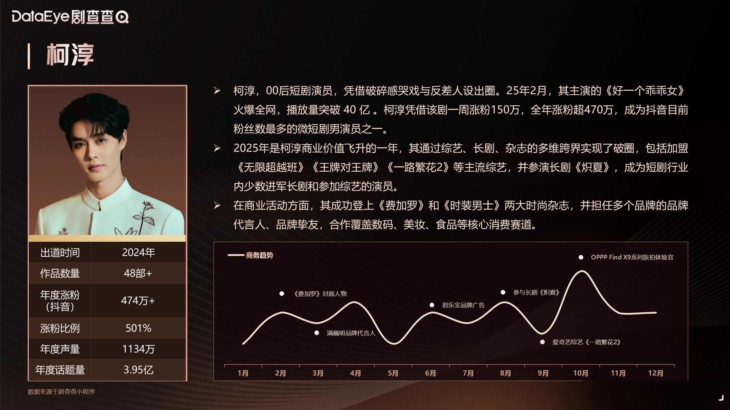 剧查查评出来的2025微短剧艺人商业价值榜男艺人榜top5:柯淳、曾辉、陈添祥、刘萧旭、马小宇女艺人榜top5:韩雨彤、李柯以、刘念、余茵、王格格柯淳还是短顶,落日雨辉也好强👍🏻