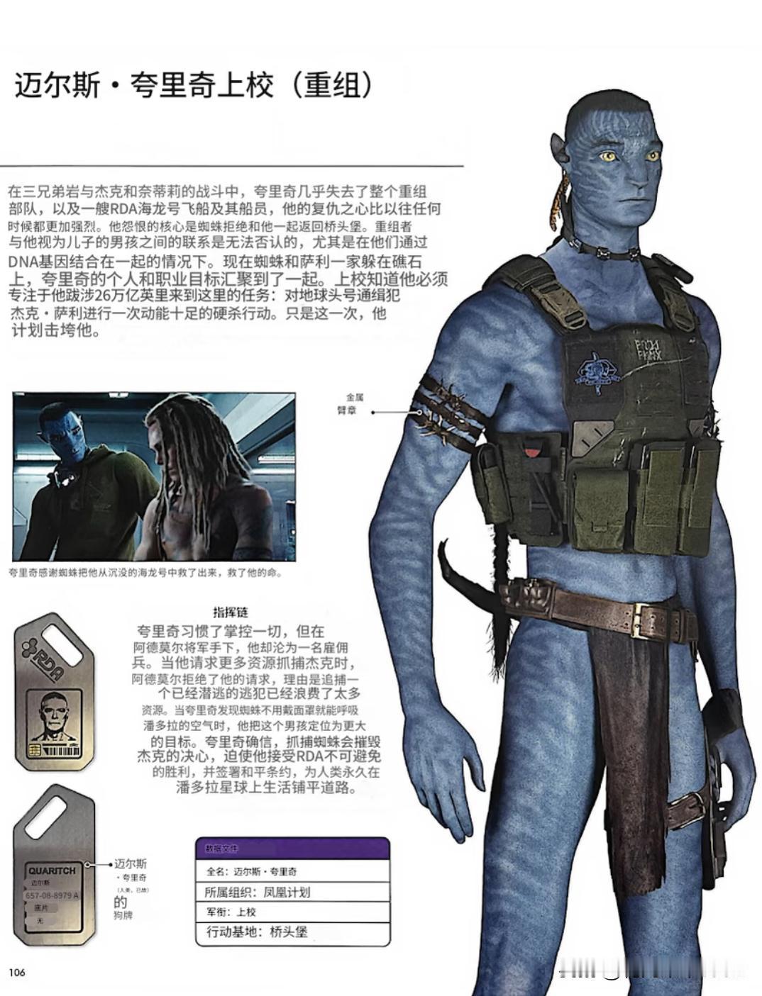 阿凡达夸里奇的人设档案 全名: 迈尔斯·夸里奇 隶属机构: 凤凰计划 军衔: 上校 行动基地: 桥头堡 迈尔斯·夸里奇上校(阿凡达重组体) 在三兄弟岩与杰克和奈蒂莉的战斗中,夸里奇几乎失去了整个重组小队以及一艘 RDA 海龙号及其船员,这使得他的复仇欲望比以往任何时候都更加强烈。 而他怨恨的核心在于蜘蛛拒绝随他回到桥头堡。尽管这个男孩并非他亲生,但作为重组体的夸里奇无法否认与他之间的血缘联系。 既然蜘蛛正随萨利一家躲在礁石区,夸里奇的私人恩怨与职业目标便合二为一了。 上校深知,他必须专注于这项跨越 26 万亿英里而来的任务:针对地球头号通缉犯杰克·萨利,展开一场充满杀戮的重锤行动。 而这一次,他计划彻底击垮杰克。 指挥系统 夸里奇习惯于主导全局,但在阿德莫尔将军手下,他被降级为一名受雇的枪手。 当他请求更多资源来抓捕杰克时,阿德莫尔拒绝了他的请求,理由是太多资产在追捕一个销声匿迹的逃犯时被白白浪费了。 当夸里奇发现蜘蛛可以在没有面罩的情况下呼吸潘多拉的空气时,他将这个男孩视为更大的棋子。 夸里奇确信,抓获蜘蛛将彻底瓦解杰克的意志,迫使他接受 RDA 必然的胜利,并签署和平协议,从而为人类永久居住在潘多拉铺平道路。 重组计划 由于极高的损耗率,凤凰计划被阿德莫尔将军视为失败之举,12 名重组体操作员中有 10 名在战斗中阵亡,且未取得实质性成果。 该计划通过向转基因人类/纳威混血儿注入资深安全部队兵员的上传记忆,来应对潘多拉的严酷环境。 虽然重组体绕过爱娃免疫反应的能力是一项关键突破,但其成本却超过了收益。 阿德莫尔正在密切监控现场剩余的操作员,评估长期收益是否能抵消目前的损失。 强力搭档 夸里奇遇到了灰烬族迷人的祭祀瓦朗,当时她的族人袭击了风之贸易者的船队,而夸里奇正与杰克·萨利合作营救蜘蛛和萨利家的孩子们。 夸里奇和杰克是她见过的第一批“天空人”,由于瓦朗的迟疑,他们死里逃生。 夸里奇坚信,瓦朗和她好战的、反爱娃的部族可以被征召成一支原住民军队对抗杰克。 他向瓦朗提供了视野、眼界以及军事手段,以实现武力与权利的真正升级。 装备与细节 身份牌: 属于已故人类迈尔斯·夸里奇的身份牌 重组体 M69-AR 突击步枪 灰烬族匕首与刀鞘: 刀刃由打击制成的晶体组成。刀身上的涂绘象征着喷发的黑火山 RDA 伊卡兰装具:该人体工程学装具由夸里奇设计,配有纹理握把和莫利系统,可支撑伊卡兰骑士并实现最佳负重