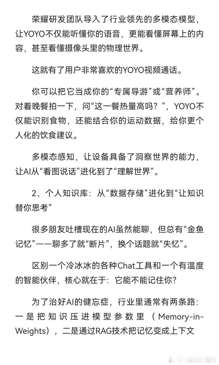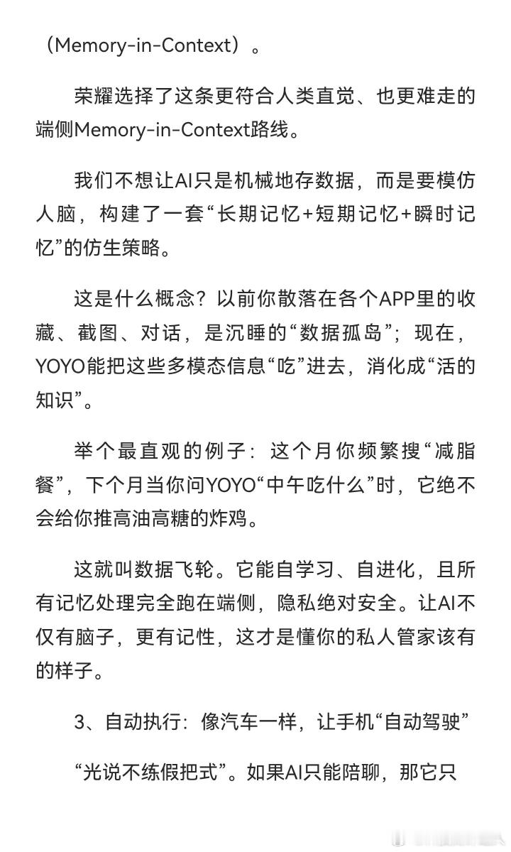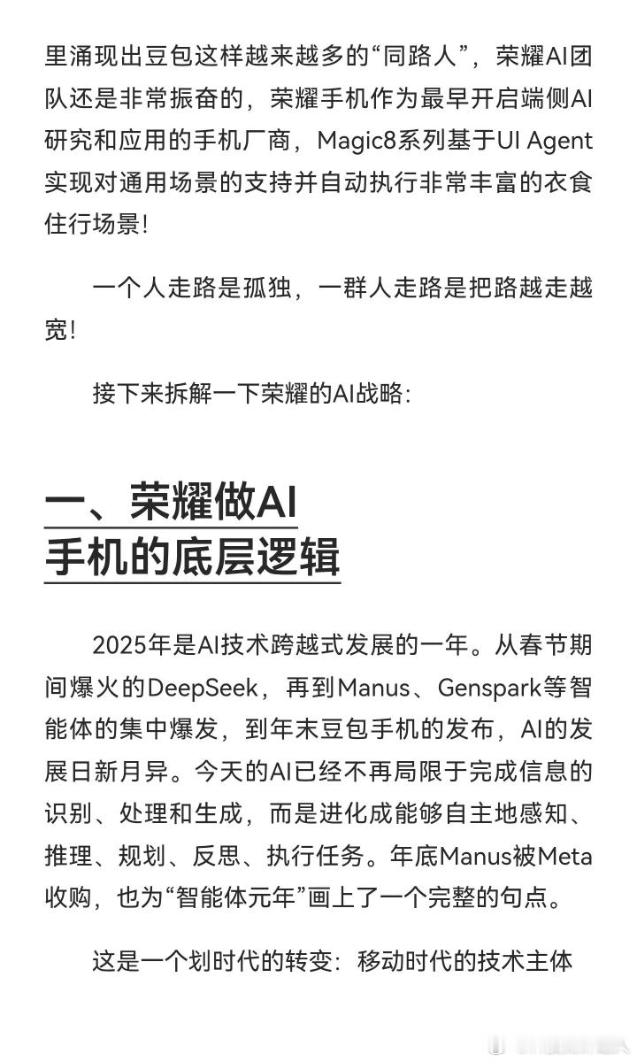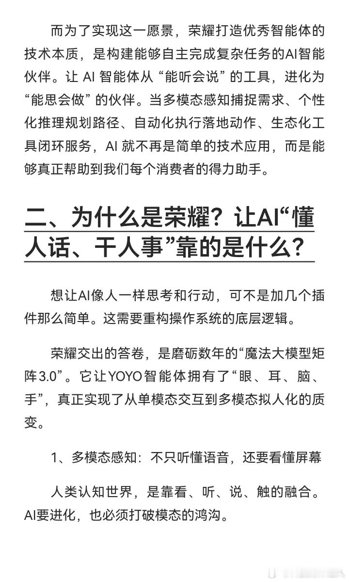这段分享真的把荣耀做AI手机的逻辑讲透了,看完特别有感触。荣耀从2020年就锚定AI重构体验的战略,五年磨一剑的坚持太难得,尤其是端侧智能体的三层架构、魔法大模型3.0矩阵,还有YOYO的多模态感知、自动执行能力,从底层重构了手机的交互逻辑。虽然荣耀说自己只是“第一探索者”,但从Magic8系列的落地效果来看,它确实把AI从“能说”带到了“会做”的阶段,这种难而正确的技术路线,也难怪能在AI手机赛道里脱颖而出。