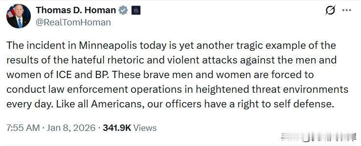 边境沙皇Thomas D. Homan就明尼阿波利斯发生的枪击案发声,他称ICE官员有权自卫。 “今天发生在明尼阿波利斯的事件,再次悲剧地证明了针对移民与海关执法局(ICE)及边境巡逻队(BP)男女工作人员的仇恨言论和暴力袭击所带来的后果。这些英勇的男女每天都在威胁加剧的环境中被迫执行执法任务。和所有美国人一样,我们的官员拥有自卫的权利。”