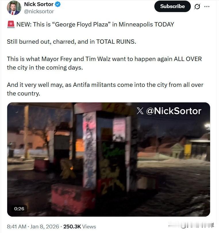 最新消息:这就是明尼阿波利斯今天的“George Floyd 广场”——依旧焦黑一片,彻底沦为废墟。 这正是Frey市长和 Tim Walz州长希望未来几天在整个城市再次上演的一幕。 随着 Antifa 激进分子从全国各地涌入,这一幕很可能真的会发生。