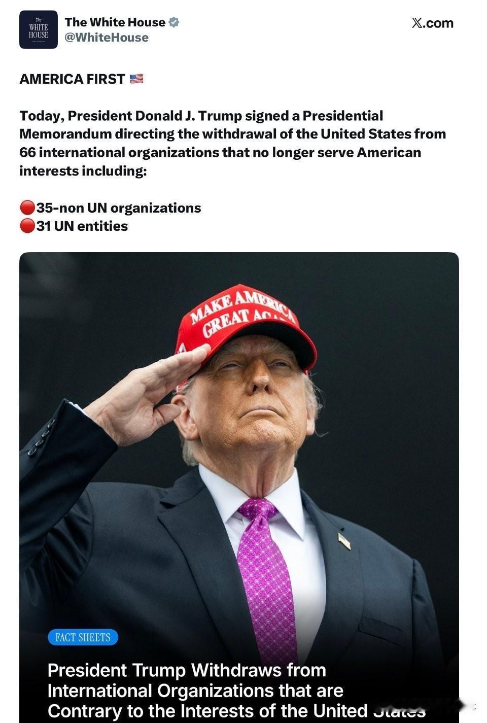 今天,川普总统签署了一份总统备忘录,指示美国退出66个不再符合美国利益的国际组织,包括: ● 35个非联合国组织 ● 31个联合国实体