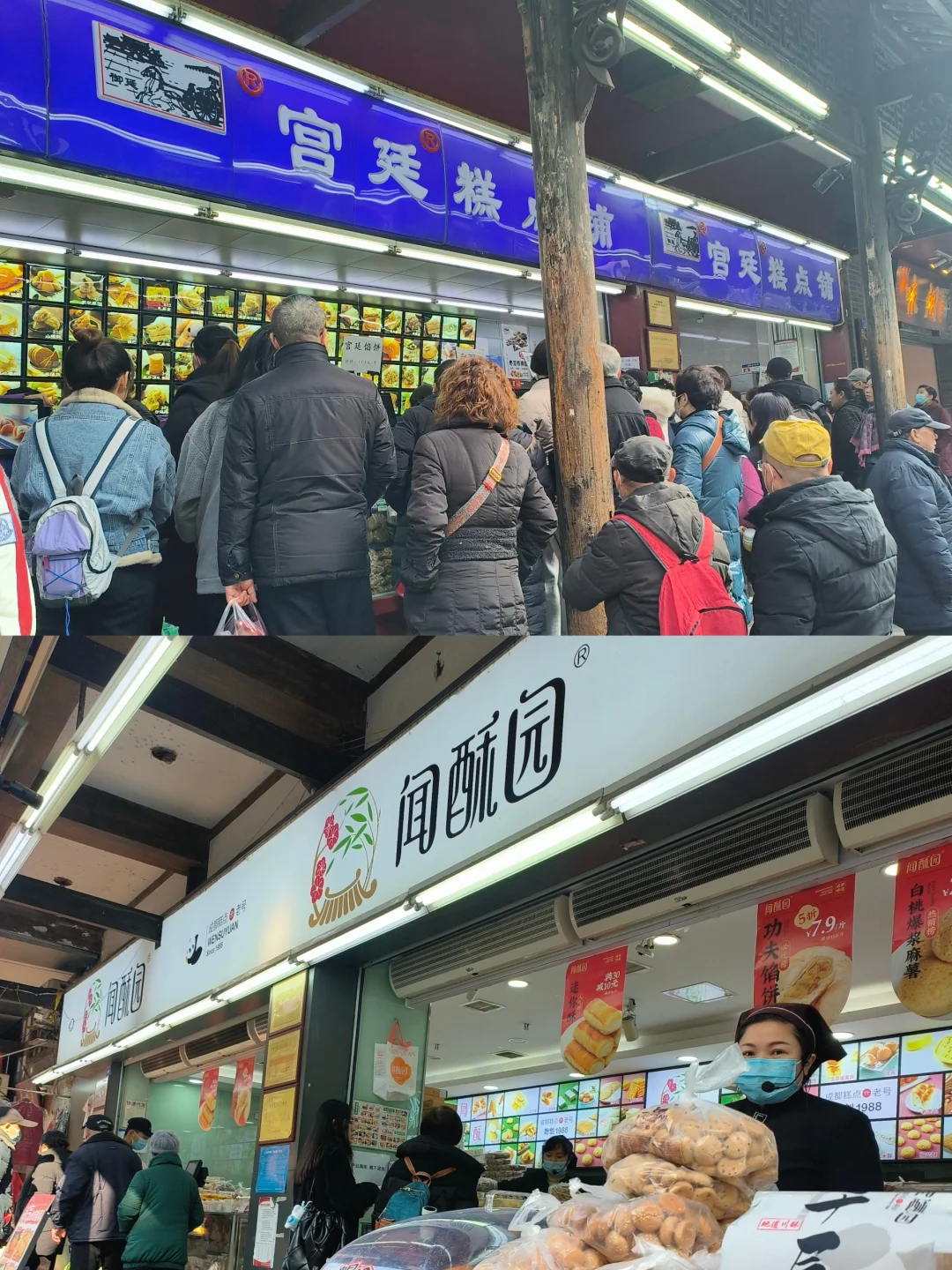 🍜拜完文殊院,可以在旁边的香园吃素斋,35元/位的自助。门口院子可以喝盖碗茶,10元/位。也可以去“洞子口张老二凉粉”,他家甜水面在成都可以算No.1。文殊院的“闻酥坊”和“宫廷糕点”一年四季都在排队,老成都的味道。自己吃买散装,给朋友当伴手礼可以买礼盒装。