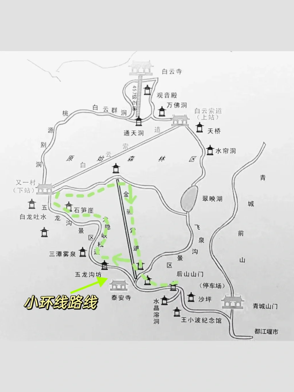 上午:青城后山(门票💰20)。走小环线,五龙沟→龙隐侠栈道→又一村→金骊索道下山(线路图在最后)。这条路线不费腿,全程大约3小时。