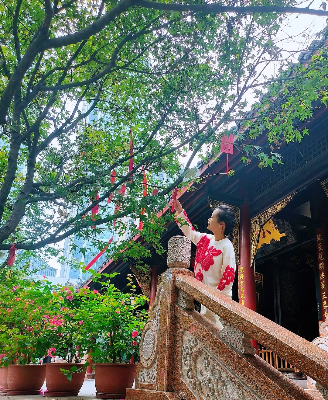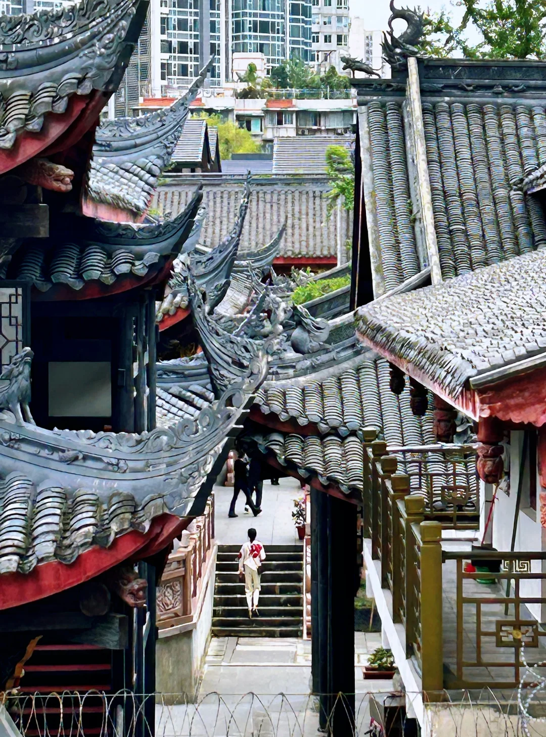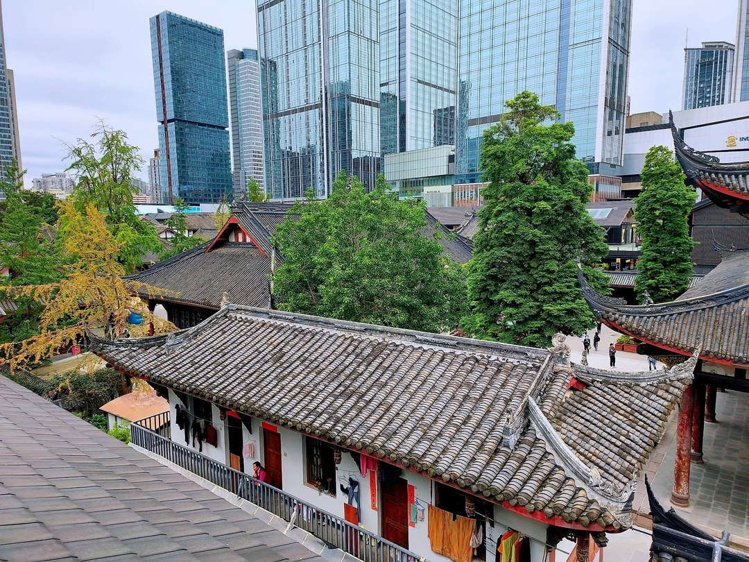 太古里面向大慈寺二楼平台(可从Versace旁边扶梯上二楼)。古刹与现代建筑的完美融合在这里一览无余。
