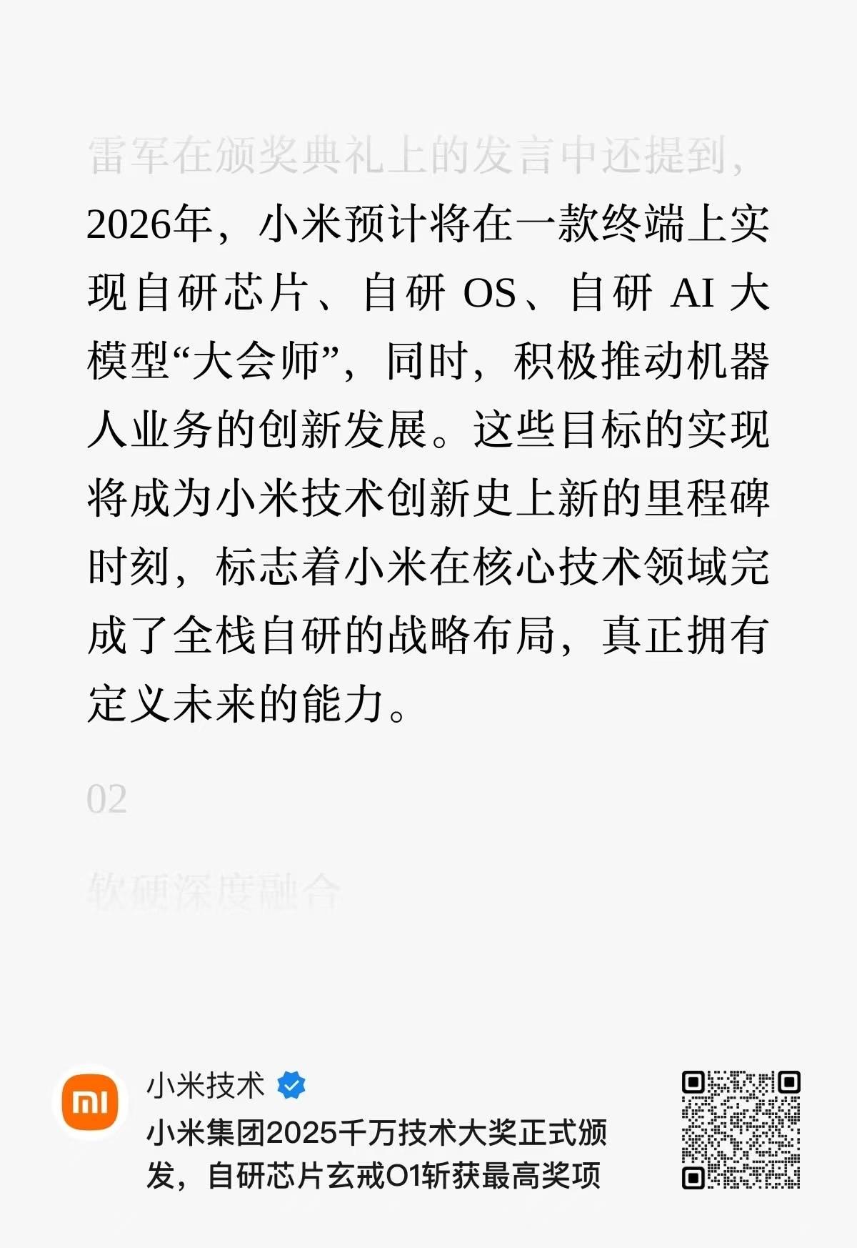 又一个大新闻! 2026年,小米预计将在一款终端新品上实现自研芯片、自研OS、自研AI大模型的“大会师”,非常刺激! 小米说是在终端新品上实现这一个东西,也就是说这个终端新品可能并不是手机,也有可能是汽车。 小米的芯片大家都见识到了,小米自研的OS大家也见到了,真的能实现三者合一,而且非常好用的话,还是很令人期待的。 各位是怎么看的?欢迎评论区留言。