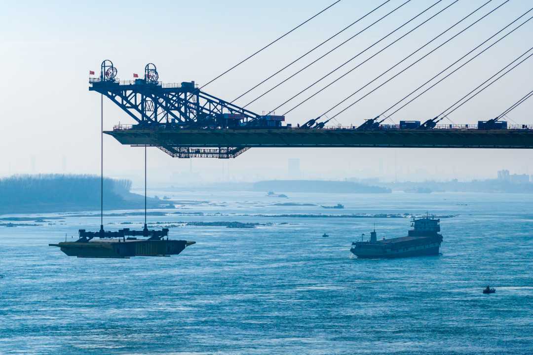 1月7日,湖北枝江长江大桥施工现场,钢箱梁吊装作业平稳推进。