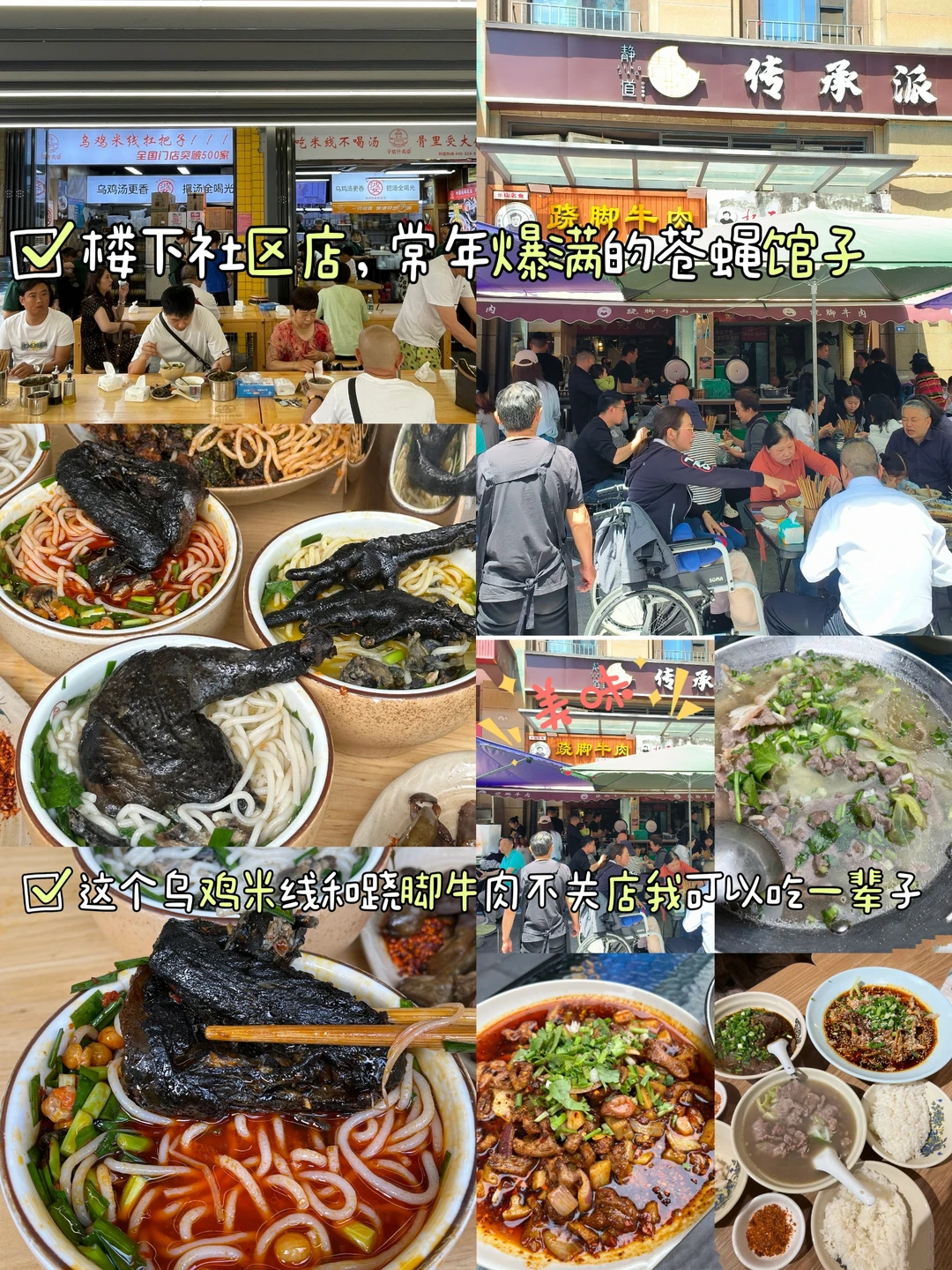 杨三孃翘脚牛肉、子宸什夹婆乌鸡米线,家楼下的社区店。连锁也很多,就近选择。