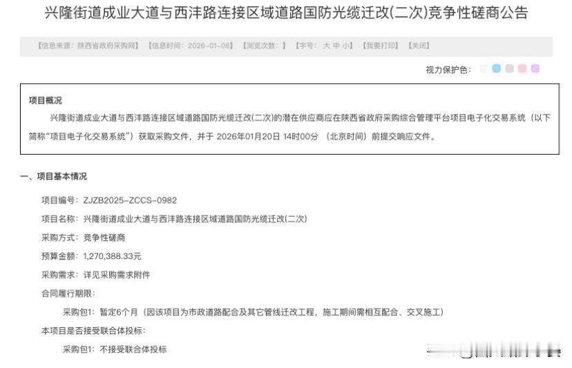 成业大道与西沣路连接区域道路国防光缆迁改(二次)竞争性磋商公告已发布,这意味着两条交通要道的连通工程要加速推进了~ 作为西安城南的交通大动脉,西沣路承载着主城区与秦岭片区的通行重任,早晚高峰车龙常排数公里,30万+沿线居民深受拥堵之苦。而成业大道周边聚集着多个产业园区和居民区,像兴隆鑫苑、西派玺悦等小区的居民,以及园区上班族,早就盼着两条路能打通,不用再绕路通勤。此前因为200米路段未交地,加上国防光缆迁改这一关键难题,工程进度受到影响,这次二次磋商重启,就是要全力攻克障碍。 而成业大道与西沣路的连通,正是这一交通网络的重要节点,打通后不仅能分流拥堵车流,还能方便市民快速前往秦岭出游,带动沿线产业发展。
