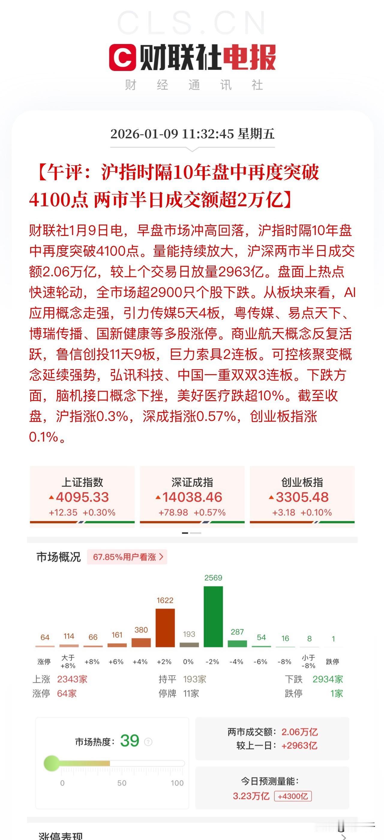 午评,沪指2026年第一个情绪高潮! 沪深两市半日放量成交2.06万亿, 上证指数一度触及4121.70点, 临近午盘情绪大分歧回落至4100点之下! 商业航天爬过一个又一个高峰, 显然龙头涨幅不达3-5倍不罢休, 要么就别信、要信就早信, 这会去关注基本“吃米田共赶不上热乎”! Ai医药、Ai传媒、Ai智能体唱主角, Ai医药方向安必平、塞力医疗、泓博医药再起, Ai传媒易点天下指点江山, Ai智能体昆仑万维、万兴科技。 然后是隔夜发酵的国产算力、AIDC, 润泽科技一度封板, 逻辑上:山西、内蒙等地能源充足价格便宜, 润建股份、首创股份数据中心有电力成本优势。 储能和电池早盘弱转强, 但随着分时情绪高点出现, 又和券商一起压盘! 总之,这里是第一个情绪分歧是买点! 存储芯片、电池都给出机会了, 防守肯定是农业银行、券商ETF等…