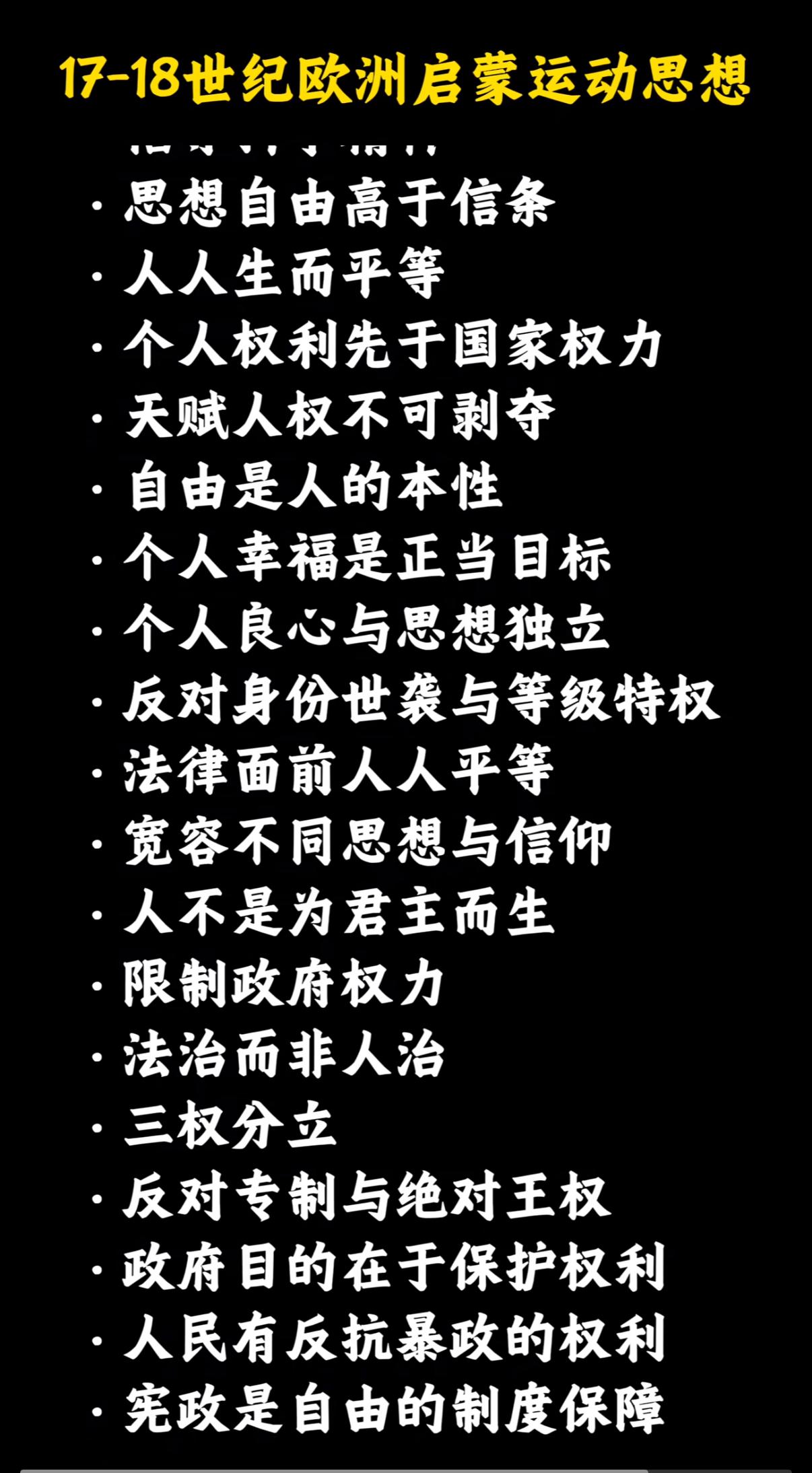 17-18世纪欧洲启蒙运动思想有哪些成果,我们一起来看看有哪些? 1、理性至上 2、主权在民 3、政府权力来自人民授权 4、社会契约论 5、怀疑一切既定权威 6、反对神学支配思想 7、知识来自经验与理想 8、反对迷信与蒙昧主义 9、倡导科学精神 10、思想自由高于信条 11、人人生而平等 12、个人权利先于国家权力 13、天赋人权不可剥夺 14、自由是人的本性 15、个人幸福是正当目标 16、个人良心与思想独立 17、反对身份世袭与等级特权 18、法律面前人人平等 19、宽容不同思想与信仰 20、人不是为君主而生 21、限制政府权力 22、法治而非人治 23、三权分立 24、反对专制与绝对王权 25、政府目的在于保护权利 26、人民有反抗暴政的权利 27、宪政是自由的制度保障 这些都是17-18世纪欧洲启蒙运动所产生的思想理论与成果,而且以此为依发展出了文明的道路。