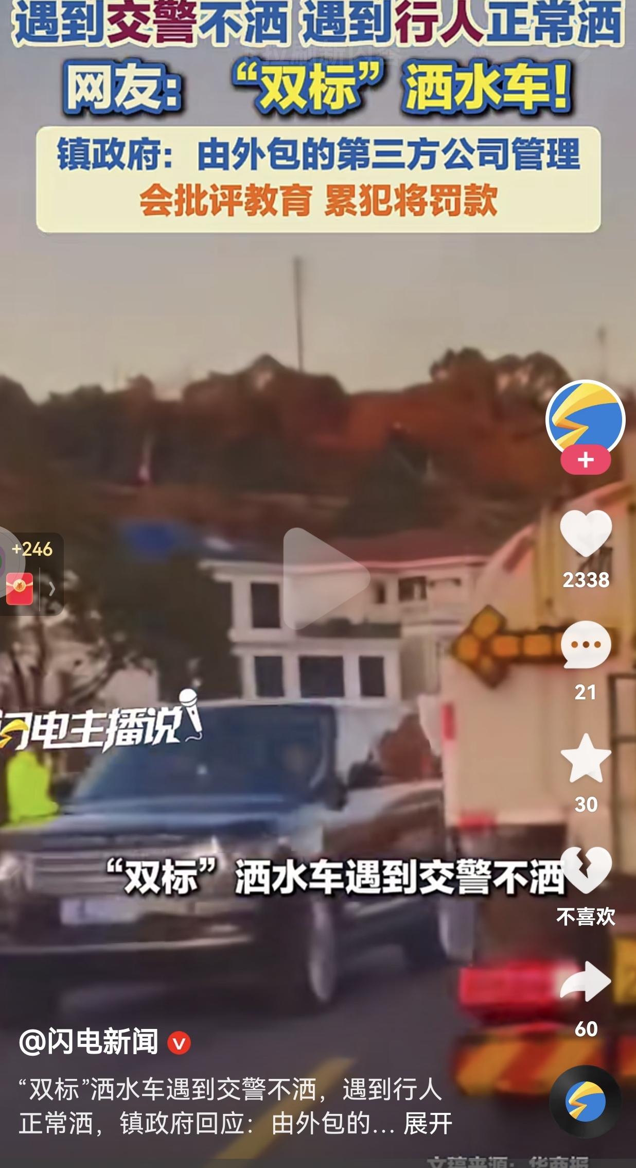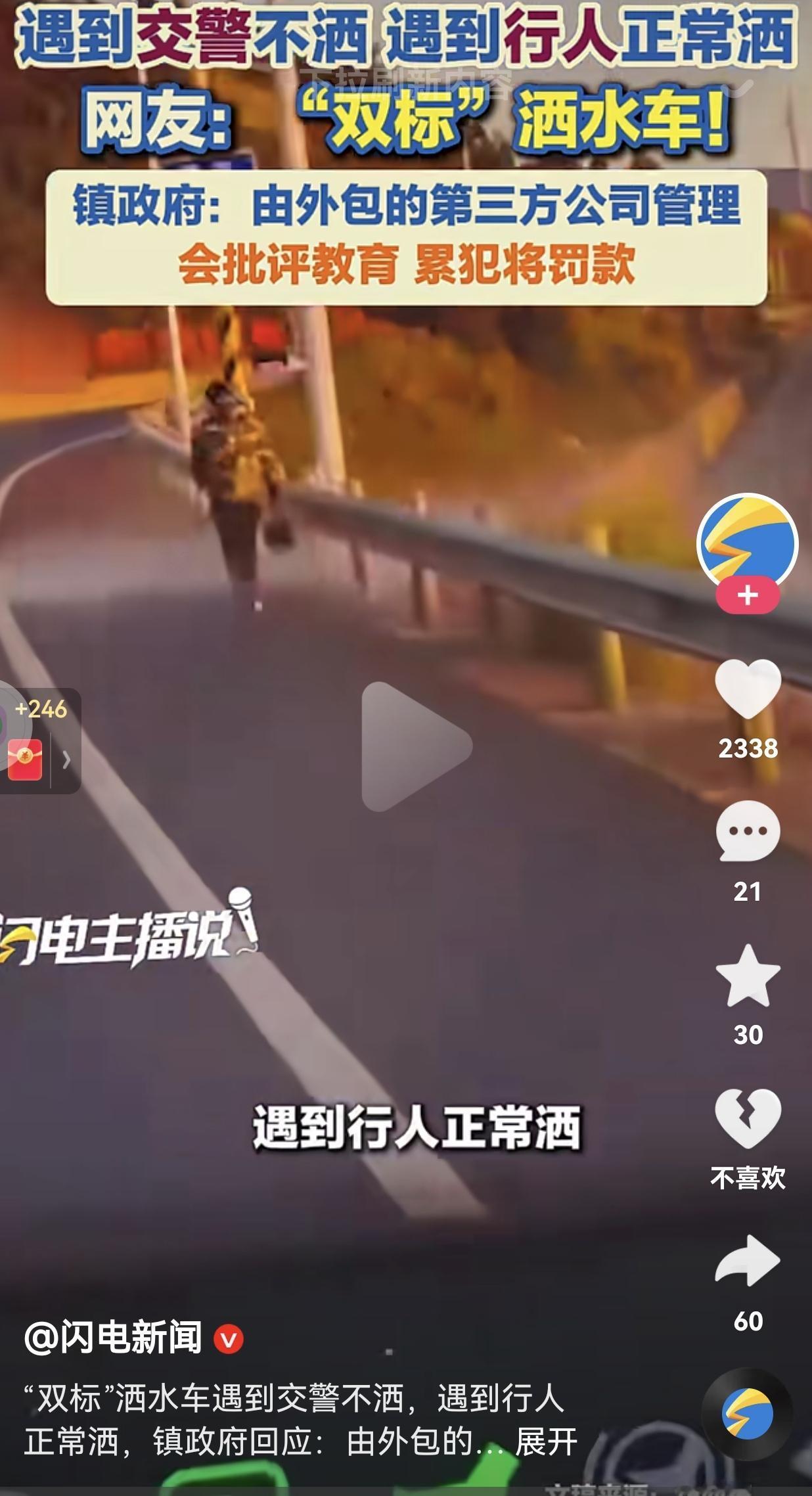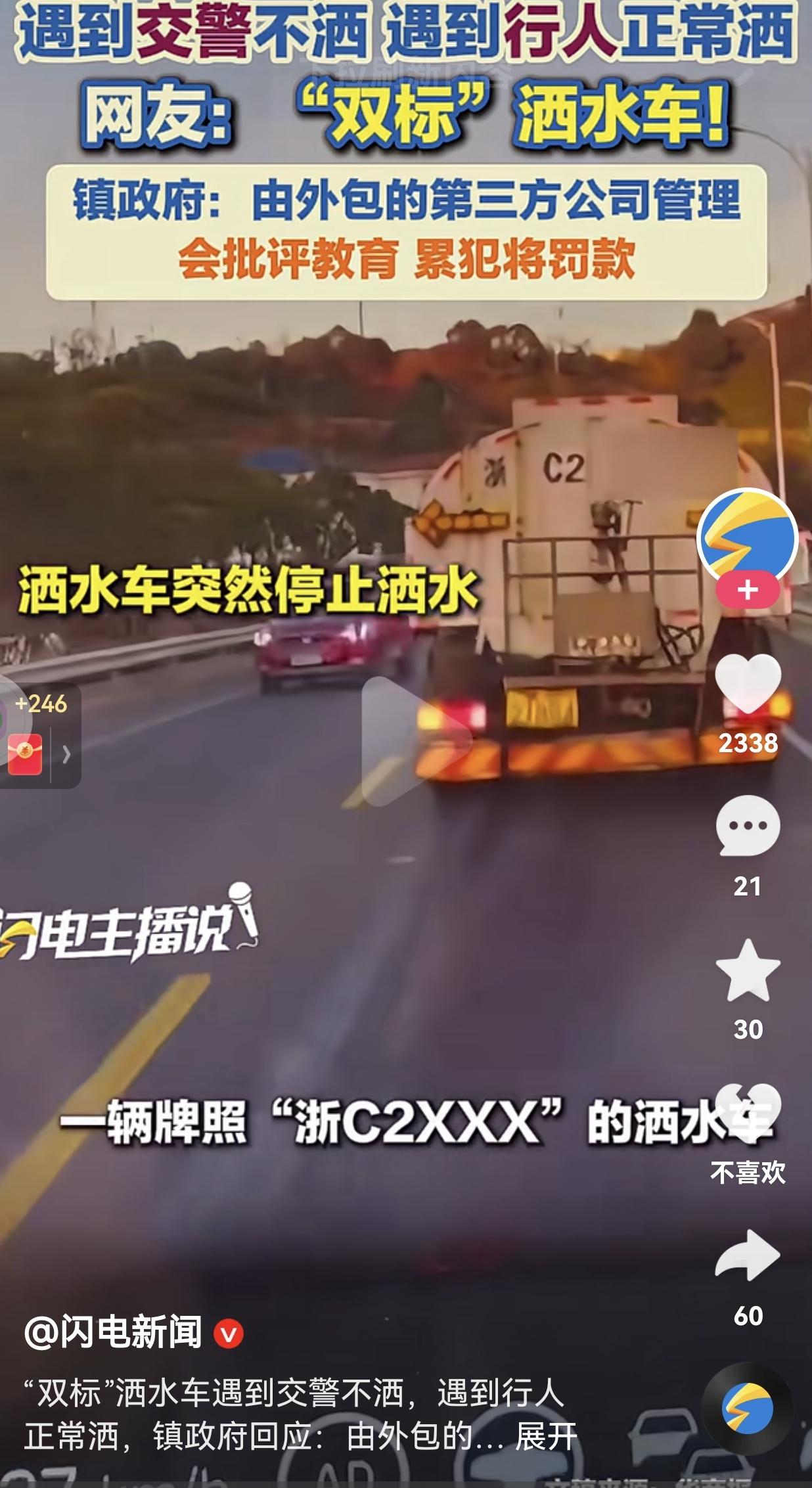太双标了!这不是区别对待吗?浙江一洒水车,遇到交警不洒水,遇到行人正常洒,镇政府