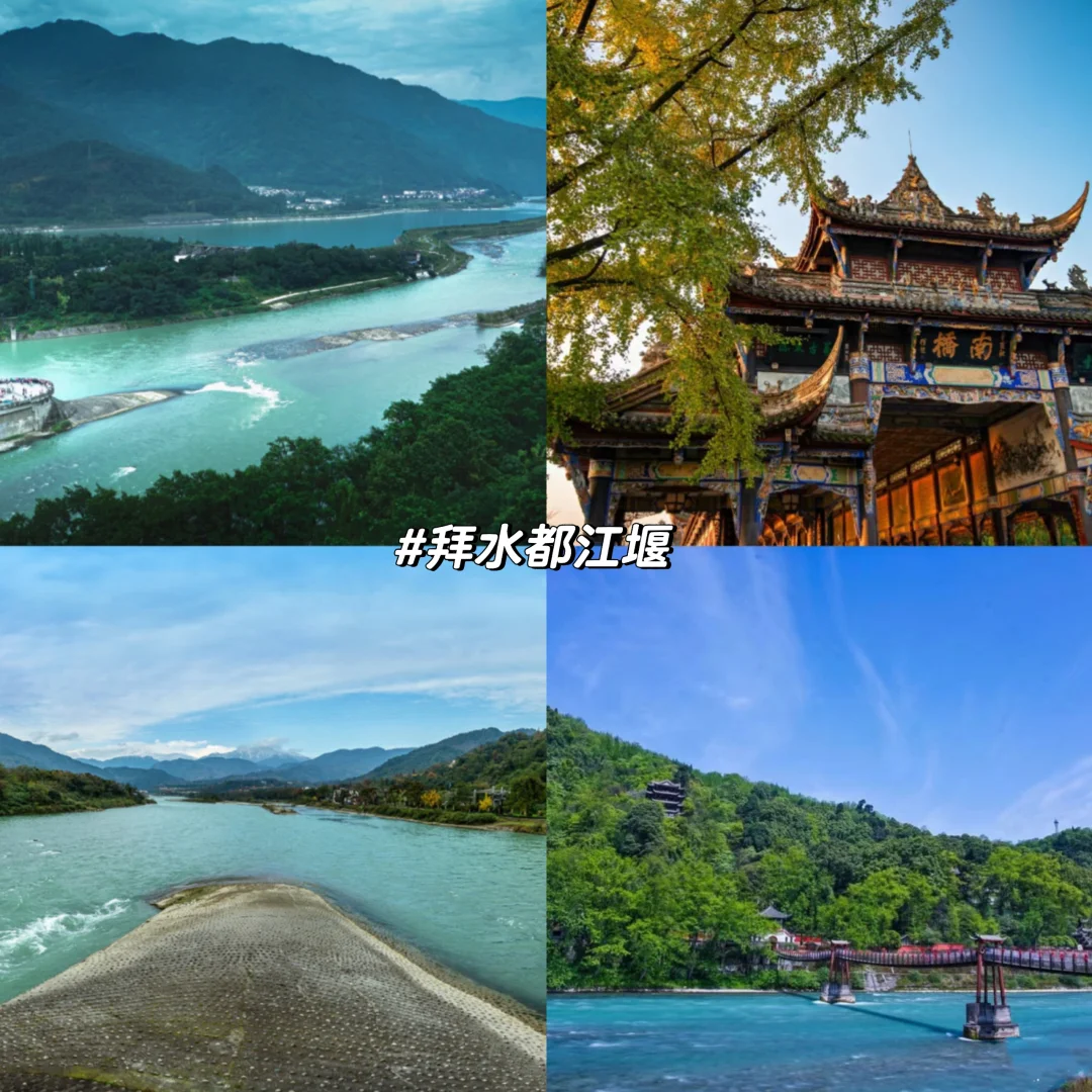 下午:都江堰。🎫💰80。感受震撼的千年水利工程,探究二八分沙原理的智慧。晚上可在灌县古城吃小吃,看完蓝眼泪返程。