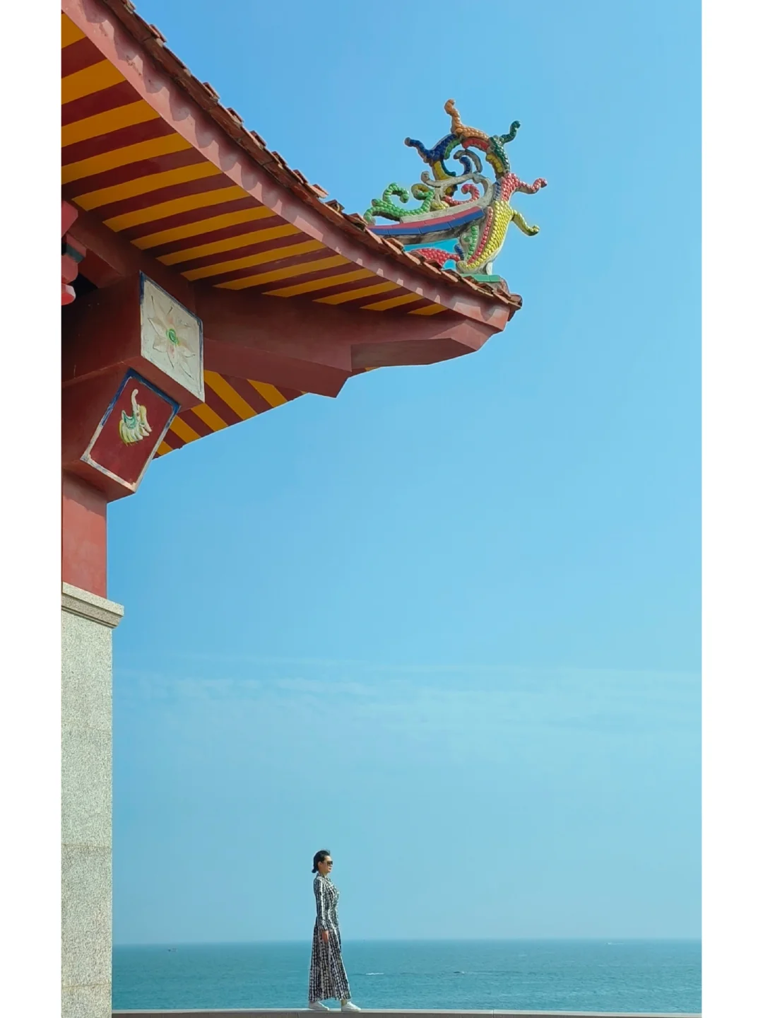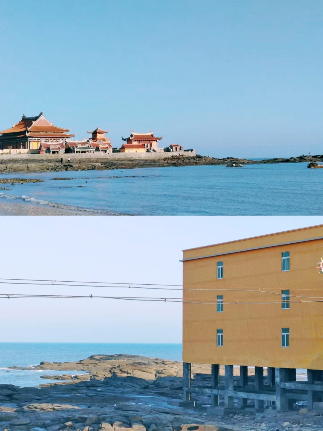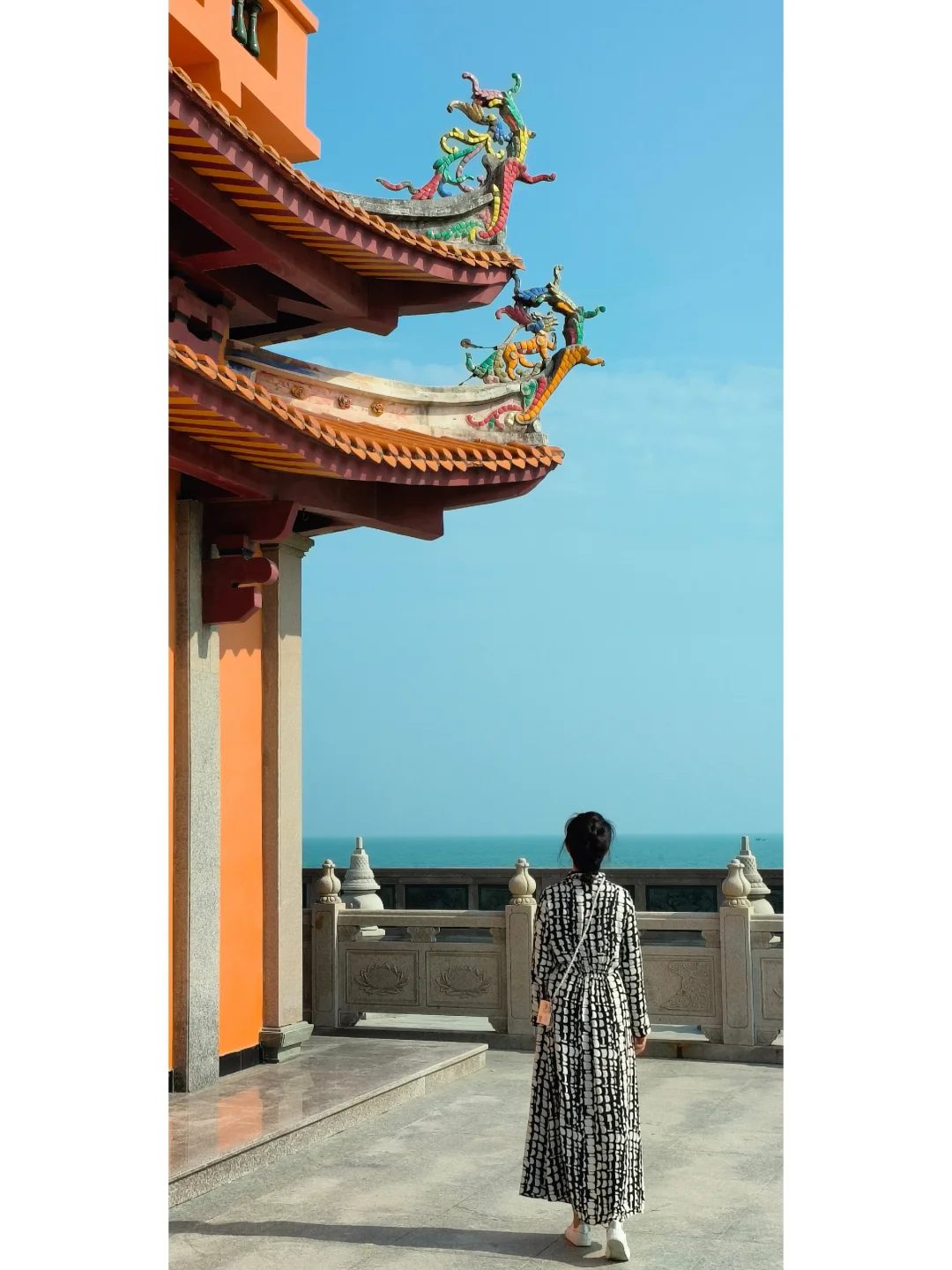 🤳沿着旁边海岸石堤走到远处可以拍到海天一色寺庙全景,很震撼
