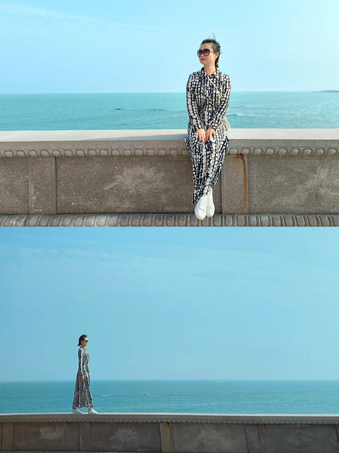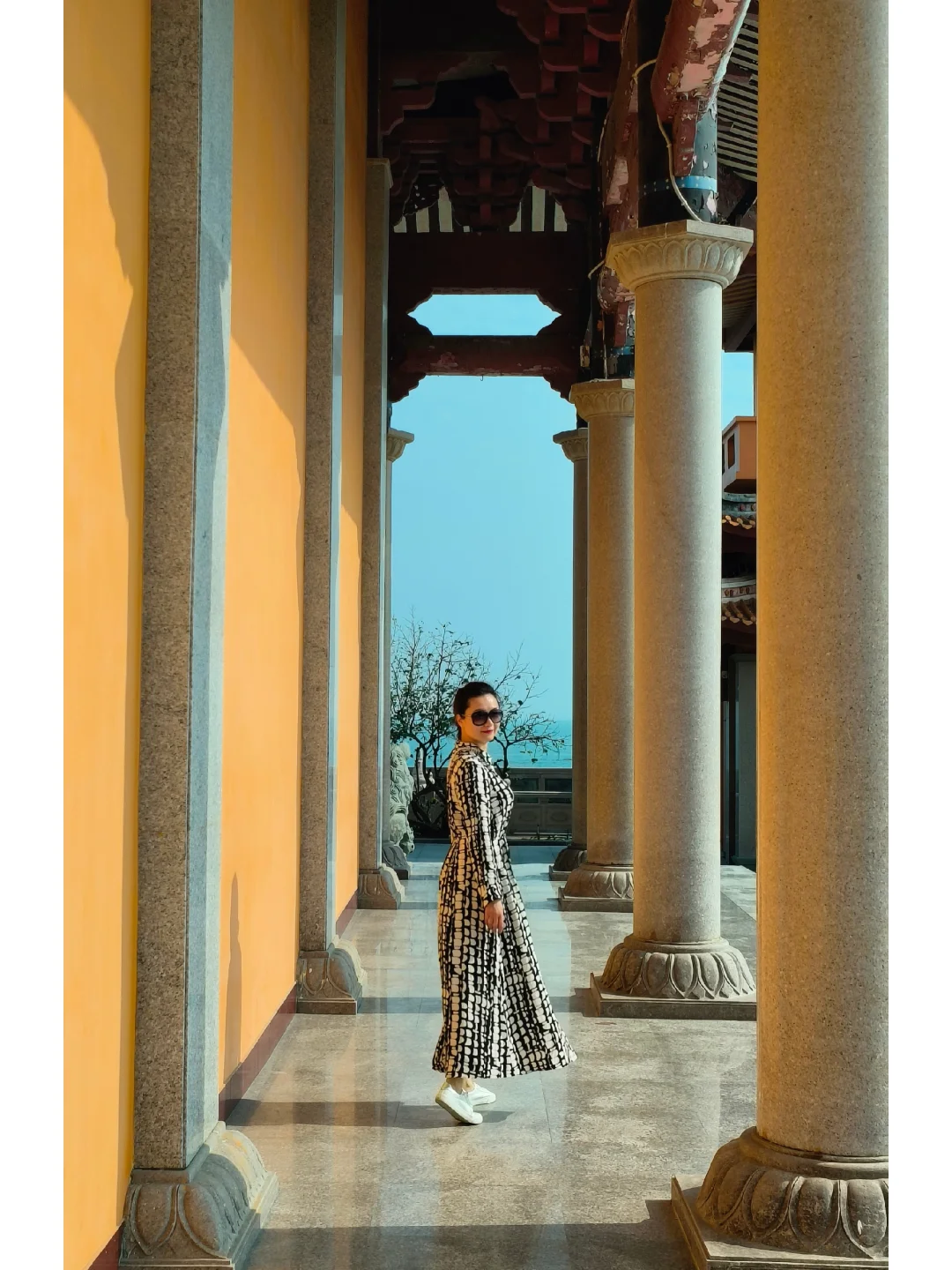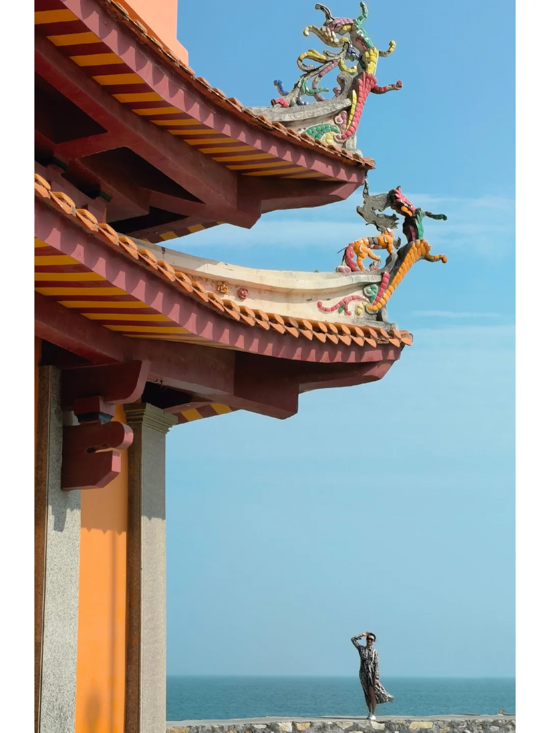 🤳沿着旁边海岸石堤走到远处可以拍到海天一色寺庙全景,很震撼