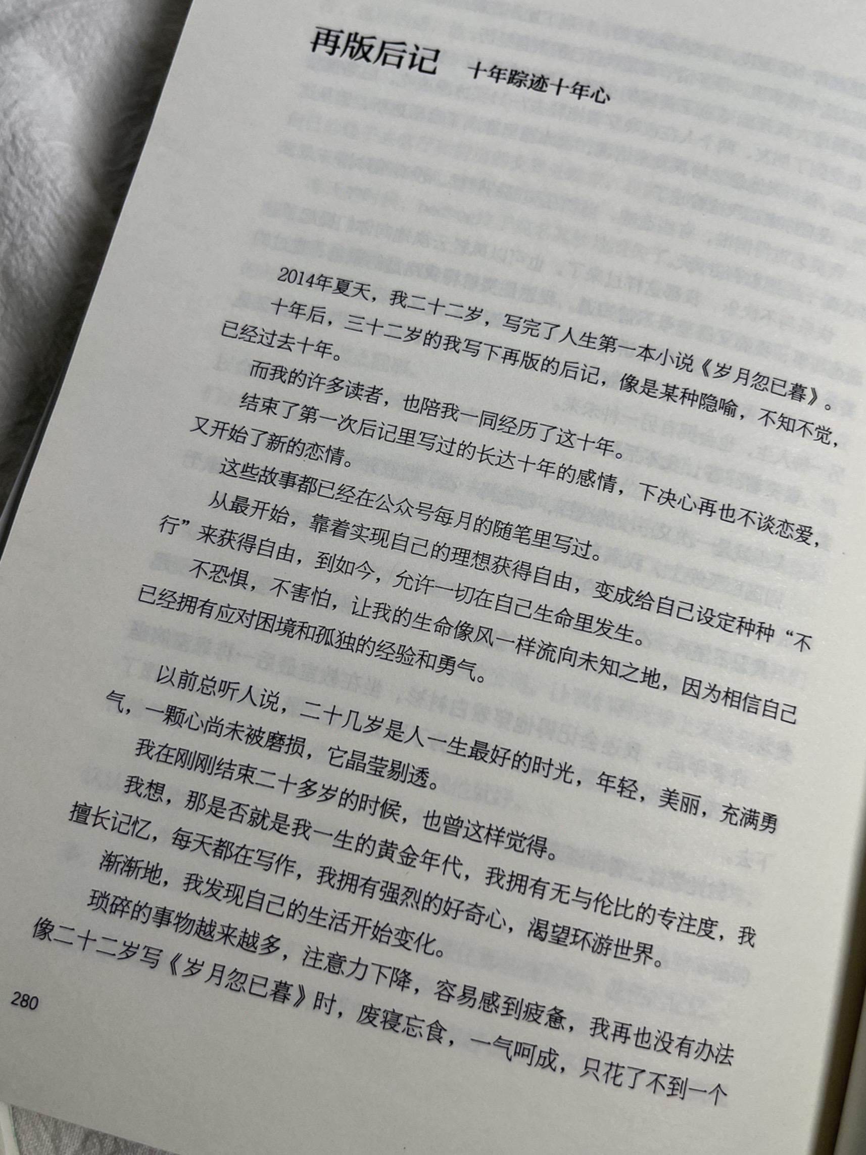 《岁月忽已暮》绿亦歌 告别了爱与被爱,我们就这样慢慢长大了。 很喜欢十年再版后记里作者的这段话: 而实现这一切的,并非上天,并非他人,而是自己。 也只有那个不曾放弃的自己,才会是陪伴你终身的人。 我们的一生,其实都只是一个,关于岁月的故事。 不要难过,不要回头,愿你所愿,终能实现。