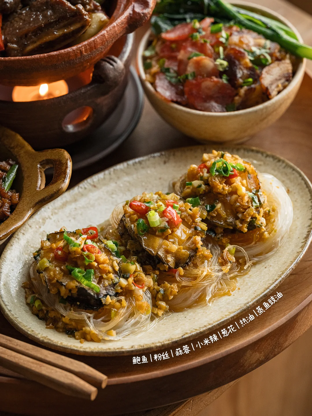🥩啫啫黑椒牛仔骨|🍜蒜蓉粉丝鲍鱼 🍚腊味煲仔饭|🫛沙茶肉末四季豆 新年仪式进行时🏮美味与氛围都不能落下 而满满的烟火气是新年最暖心的开场白🔥 - 🥩啫啫黑椒牛仔骨 ❶牛仔骨煎香,爆香料头 ❷加入黑椒汁后大火搅拌收汁 🍜蒜蓉粉丝鲍鱼 ❶粉丝泡软摆盘,放上鲍鱼,加蒜蓉酱蒸熟 ❷撒上葱花小米辣,淋蒸鱼豉油,泼上热油 🍚腊味煲仔饭 ❶泡好的米用砂锅煮熟,加入腊肠焖熟 ❷淋油起锅巴,加入酱油和葱花及菜心 🫛沙茶肉末四季豆 ❶四季豆焯盐水备用,煸香肉末和姜蒜 ❷加入沙茶酱和调味料后翻炒食材 -