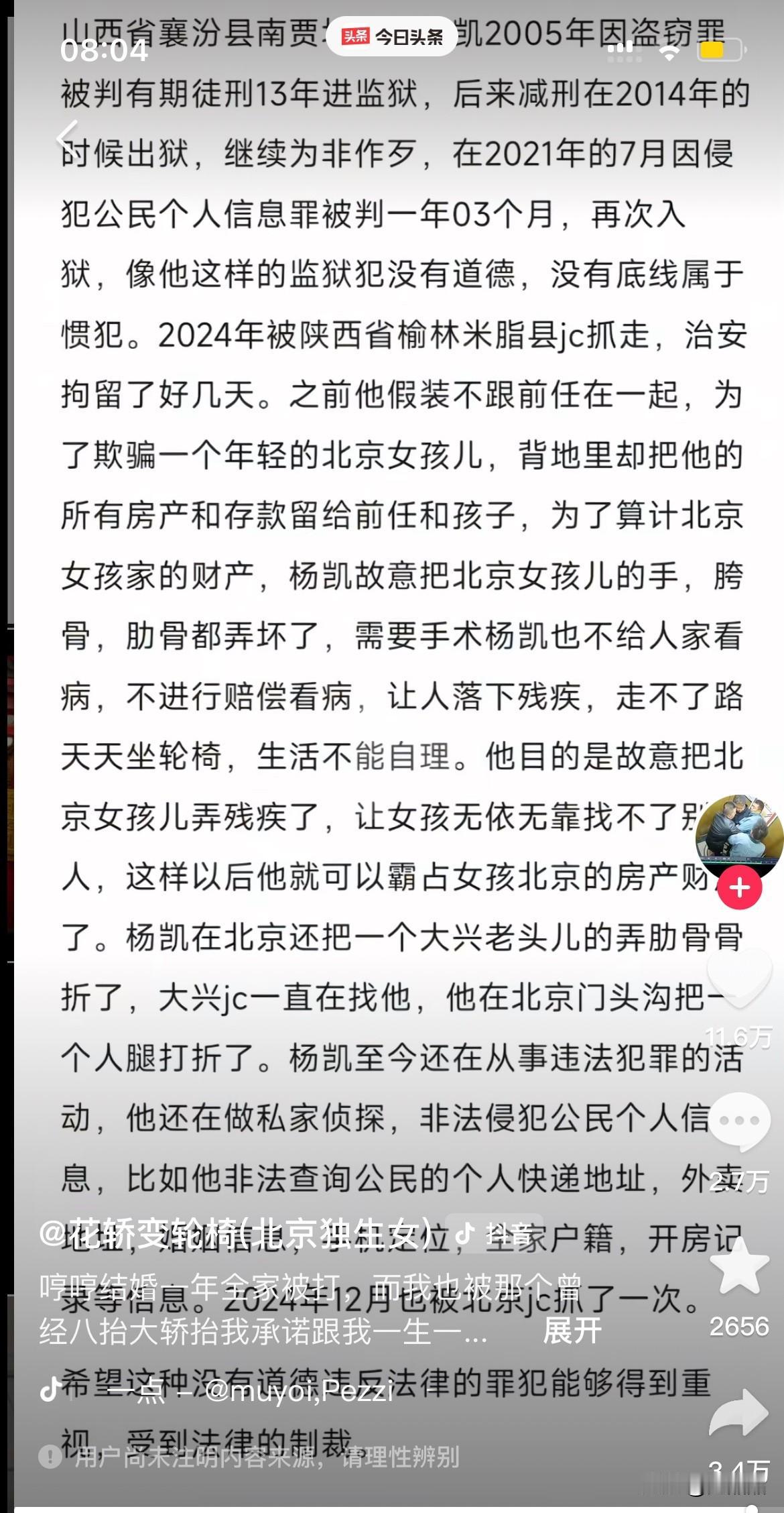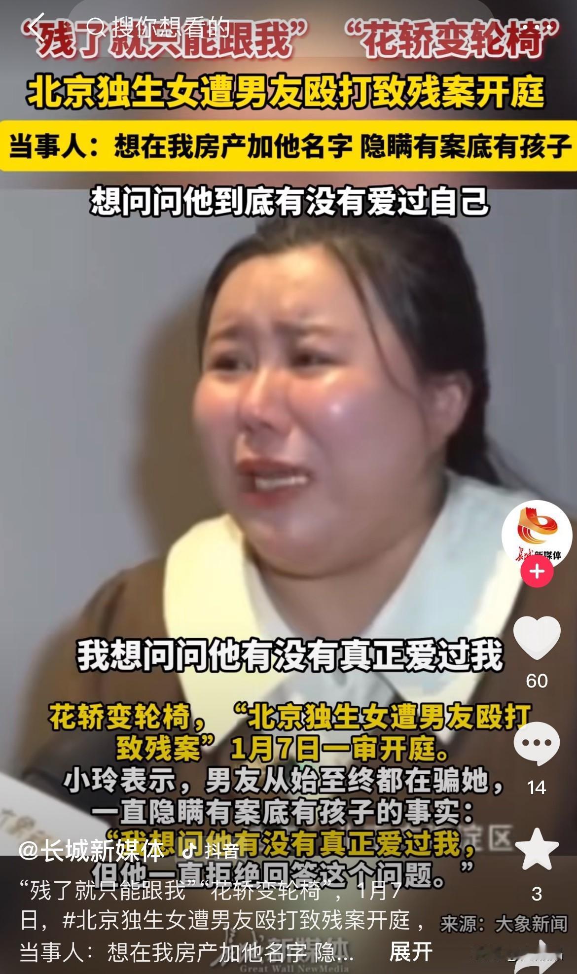 吃绝户!北京,一女子在朋友聚会认识了男友,男友得知她是独生女,北京有房,恋爱时百般呵护女子,没想到所有的好都是装出来的,图的就是她北京的房。 2022年底,男友对女子疯狂追求,各种甜言蜜语,又是礼物又是陪伴,在女子父母面前也是忙前忙后,主动做饭做家务,女子心生感动,就答应了追求,男友顺理成章住进了女友家。 一次在和男友朋友的饭局中,男友朋友说漏嘴,说他们之前犯案之事,女子才得知男友有过案底。 早在2005年,男友因盗窃罪被判13年,2021年男友又因侵犯公民个人信息被判一年3个月。更让女子震惊的是,男友虽是未婚,却和前任生了孩子,他名下的房产和存款全都转到前任名下。 得知男友的骗局,女子想要分手,男友竟施予暴力,打得女子重伤,还故意拖延时间不给女子治疗,导致女子落下终身残疾,出行需要坐轮椅,生活不能自理。 男友施暴时还说:“打残了,以后只能跟我。”旁观者听着都瘆人。 男友的如意算盘打得太好了!一开始追求女子就心思不纯,看中女子是独生女,和她结婚,以后北京的房子就是他的了,恋爱时,男友也要求女子将房产加上他的名字,如果婚后再买房,就要写他儿子的名字。 如今,女子将男友告上法庭,男友还威胁:“上法庭不是你死就是我活”,因为两人还没结婚,不受婚姻法保护,女子的损失和伤害维权比正常家暴更为艰难,希望女子能早日得到公平公正的结果,让作恶多端的男友得到该有的惩罚。 女子竟还天真地问男友:“你到底有没有爱过我”。 这事给了我们一个忠告,恋爱和婚姻要带眼识人,擦亮眼睛,不要被男人的甜言蜜语给哄骗,短时间的逢场作戏看不出来人的好坏,要长时间考察一个人的品性和作风,毕竟婚姻是大事,一定要慎重,三思而后行。