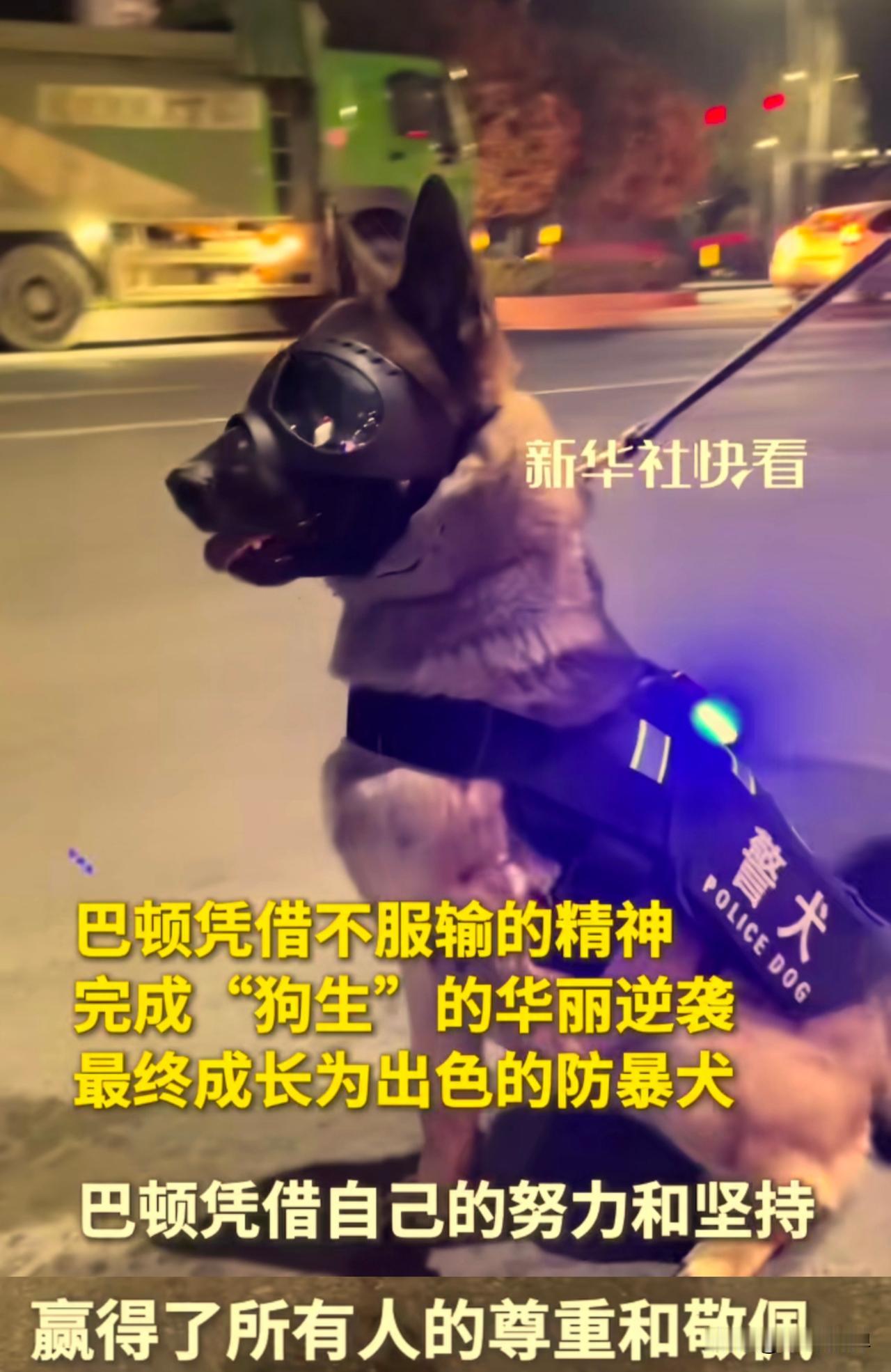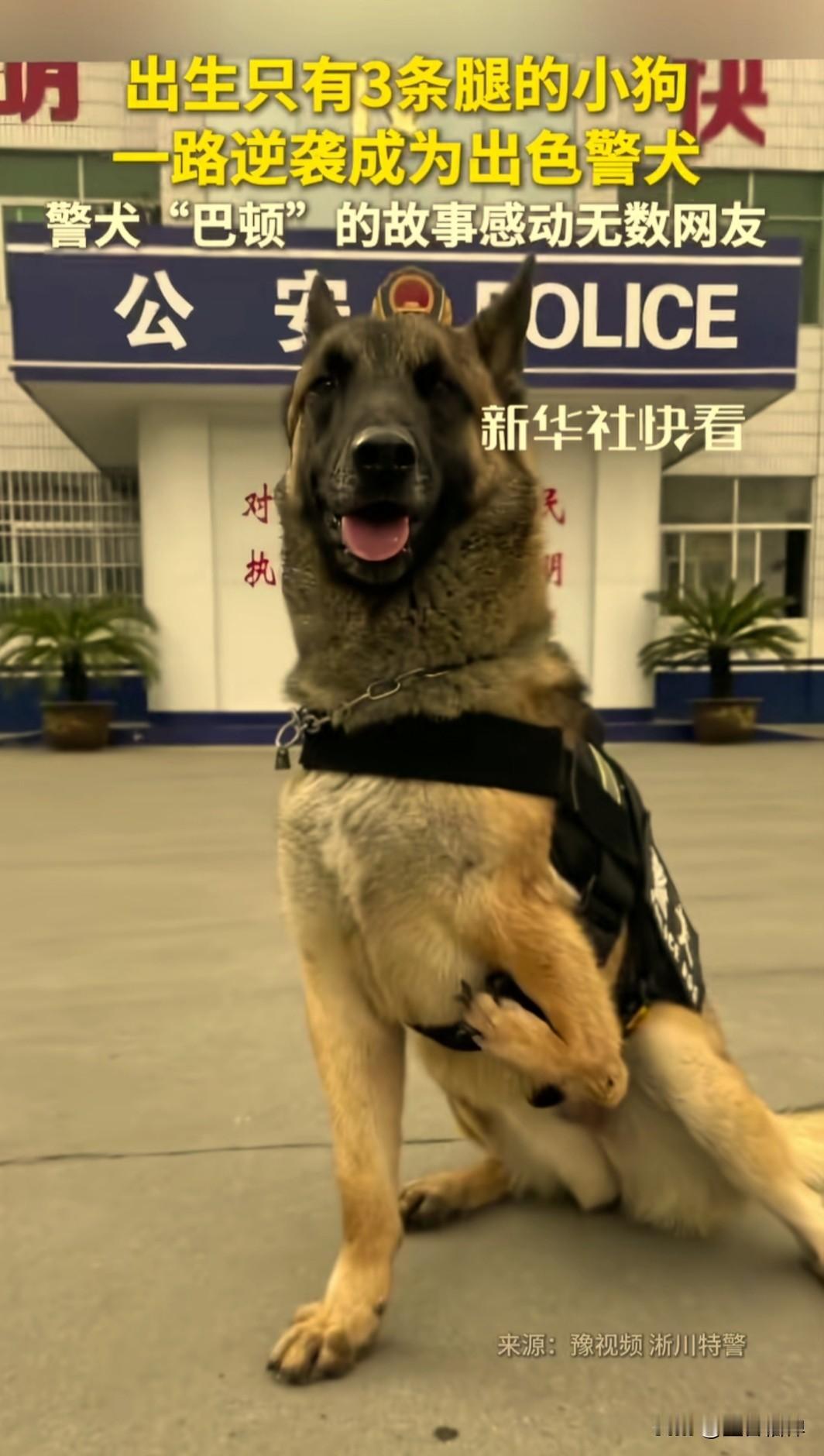 天生残疾又如何,不被看好又如何,这只出生只有3条腿的小狗,一路逆袭成为一只出色的防爆警犬。 小狗名叫巴顿,是一只雄性马里努阿犬,2019年出生于河南省南阳市淅川县公安局巡特警大队警犬中队。 巴顿虽然出生在警犬世家,但是出生就有左前腿先天性残疾,因为它可能都没办法生存,医生甚至曾建议放弃它,对它实施“安乐死”。 警队的训导员于心不忍,就为他找了一户领养家庭,希望它能够安稳度过一生。领养的这户人家给它起名叫“巴顿”,寓意勇敢坚强。 这巴顿虽然身体残疾,但是它体内毕竟流淌着警犬的血液,它精力极其旺盛,力气很大,攻击性也很强,还喜欢打架,一般家庭难以驯养,几个月之后,领养人把它送回了警队。 回到警队后,巴顿的命运也出现了转机,它看到其他警犬在训练的时候,它也表现得很兴奋,在一旁蹦蹦跳跳,眼神里也充满渴望。 这时训导员李晓东决定给这个顽强的小生命一个机会,它很有当警犬的天赋,热爱训练,比一般的警犬都能吃苦。 由于重心不稳,它在奔跑、扑咬的时候经常会摔倒在地,有时候因为冲击力太大,导致摔倒躺在地上不动,但很快又会立刻爬起来,继续冲锋。 训导员说:“不考虑它身有残疾的情况下,巴顿就是这一窝马犬里面综合警务品质最高的。当时考核的时候所有人不相信它能通过,但最后它确实通过了考核”。 它这种不服输的精神,打动了所有人,2021年7月,两岁的巴顿凭借实力,正式通过了河南省公安厅警犬资格认证考试,成为了一只拥有“编制”的防暴犬。 2024年1月,它更是在“中国首届爱宠盛典”上荣获“不屈斗士奖”,成为了名副其实的“年度宠物”。 巴顿也像一面镜子照亮了我们所有人,它天生残疾,从不自怨自艾,每次都会拼尽全力。最终凭借着不服输的精神,完美华丽逆袭它的“狗生”。 我们的人生怎么能轻易放弃呢?