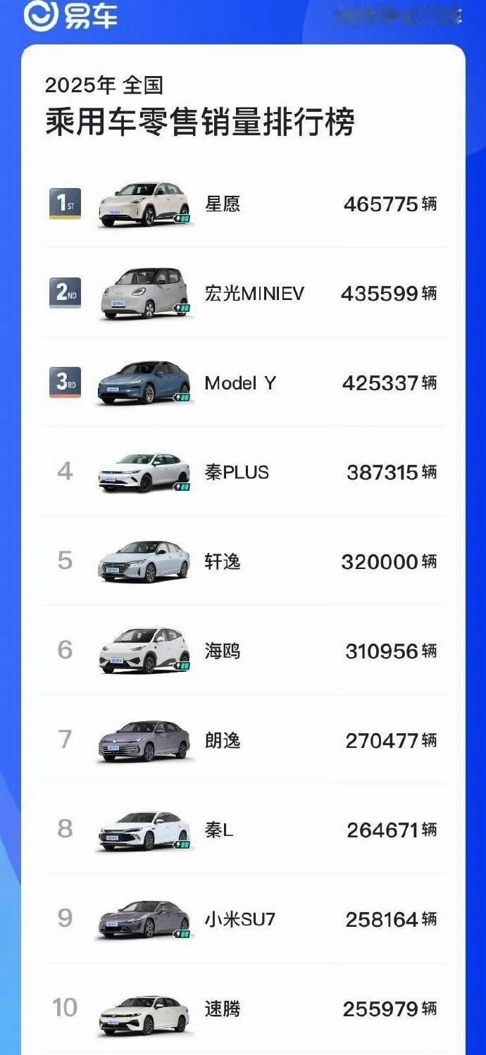 看了易车这份2025年销量总榜,最直观的感受就是:中国车市的“基本盘”依旧稳固在10万元级别。 榜单前十名里,像星愿、宏光MINIEV、秦PLUS、海鸥、轩逸这些车型,几乎都是主打高性价比的家庭用车。它们的集体成功说明,对于绝大多数普通家庭来说,经济、实用、可靠仍然是购车的核心考量。 当然,我们也看到了变化。Model Y和小米SU7能挤进前十,而且是为数不多价位在20万以上的车型,这本身就是中国消费升级和新能源接受度提高的信号。它证明市场正在分层,一部分消费者开始愿意为更强的品牌、技术或设计支付溢价。