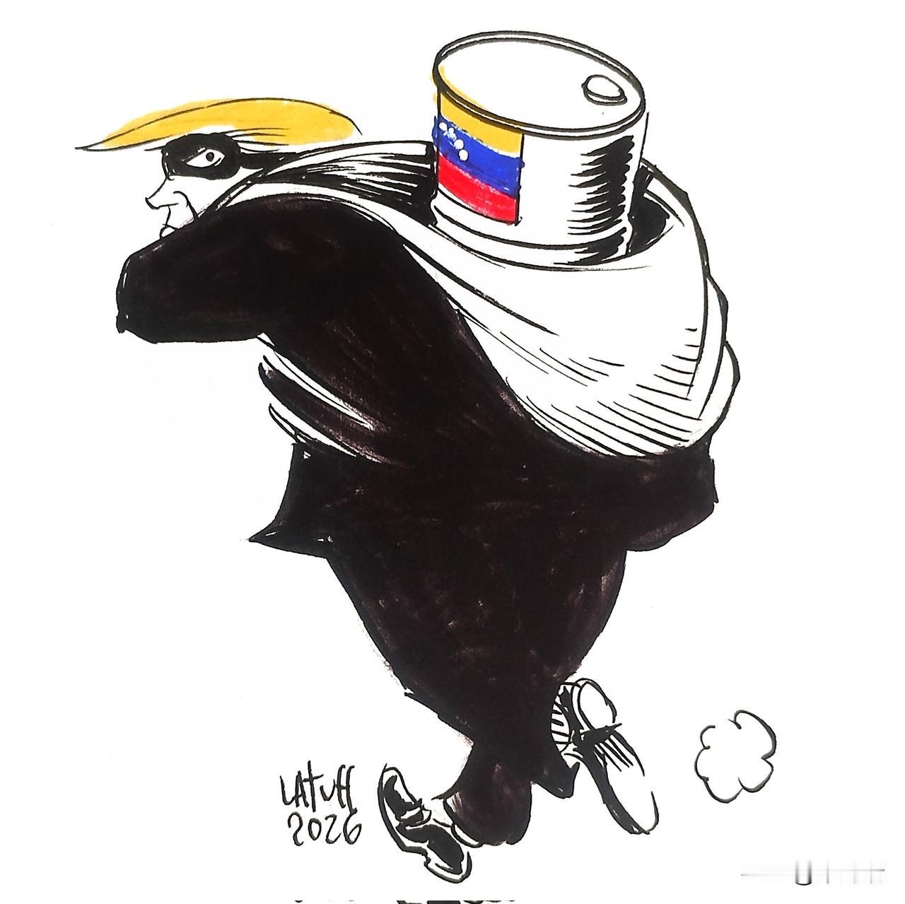 这是一份日本共同社(Kyodo News)的无线电传真(radiofax)早间版剪报,日期为 2026 年 1 月 9 日。剪报内容包含多条国际和国内新闻,旁边配有巴西政治漫画家卡洛斯·拉图夫(Carlos Latuff)绘制的讽刺漫画。 新闻头条及相关漫画反映了以下事件: 国际新闻 德国总统谴责美国政府对委内瑞拉的袭击是“抢劫”: 这指的是 2026 年 1 月 3 日美国针对委内瑞拉的一次军事行动,行动中美军特种部队逮捕了委内瑞拉总统尼古拉斯·马杜罗(Nicolás Maduro)。旁边的漫画描绘了一个疑似美国前总统特朗普(有其标志性的发型)的人背着一个印有委内瑞拉国旗和星形图案的油桶,讽刺美国对委内瑞拉石油资源的企图。这幅漫画由拉图夫创作,旨在批评美国的干预主义。 中国延迟日本清酒的通关: 剪报的日语部分和手写标题都提到了这一事件,暗示可能与政治紧张局势或贸易争端有关。 国内新闻 (日本) 义务化计算建筑二氧化碳排放: 针对面积 5000 平方米以上的建筑。 丹羽宇一郎去世: 首位民营企业出身的中国大使。 在引擎盖上载着警察行驶: 大阪一名 40 岁男子因涉嫌谋杀未遂被捕。旁边的漫画描绘了一辆汽车在行驶,引擎盖上躺着一个人,另一人(疑似警察制服)压在他身上。 这些剪报和漫画是卡洛斯·拉图夫“无线电传真剪报本”(Radiofax Scrapbook)系列的一部分,他经常通过这种方式分享世界各地的时事和他的政治观点。