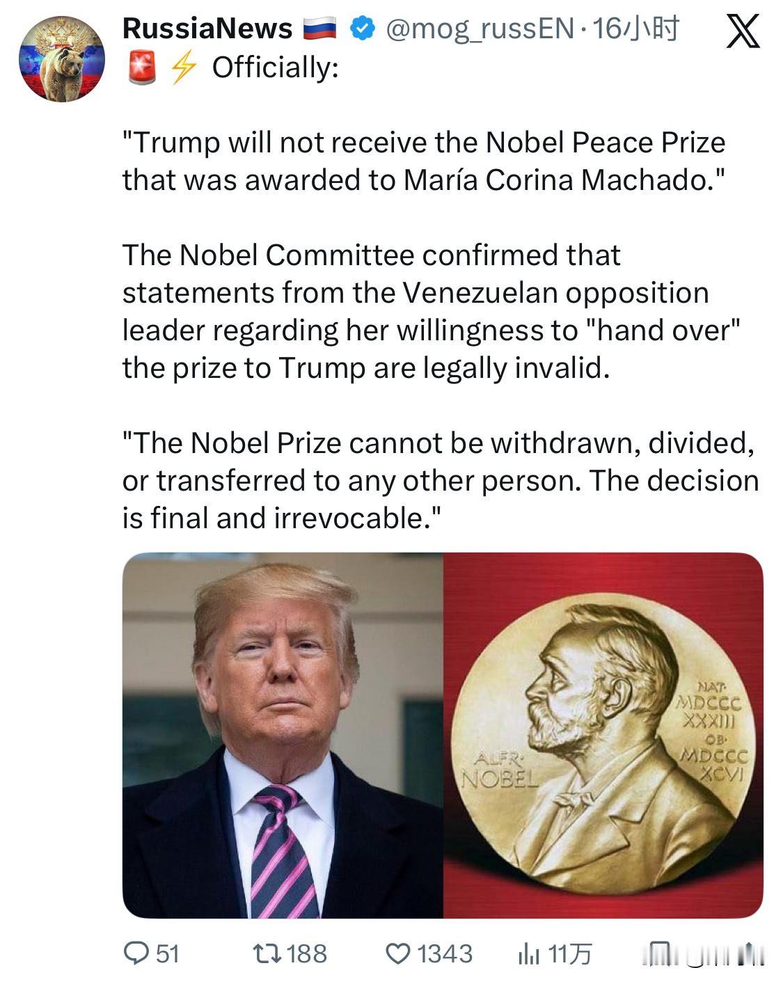 挪威诺贝尔委员会官方说法: “特朗普将不会获得授予玛丽亚·科琳娜·马查多的诺贝尔和平奖。” 诺贝尔委员会确认,委内瑞拉反对派领导人关于她愿意将诺贝尔奖“移交给”特朗普的声明在法律上无效。 “诺贝尔奖不可撤回、分割或转让给任何其他人。该决定是最终的,不可撤销。”