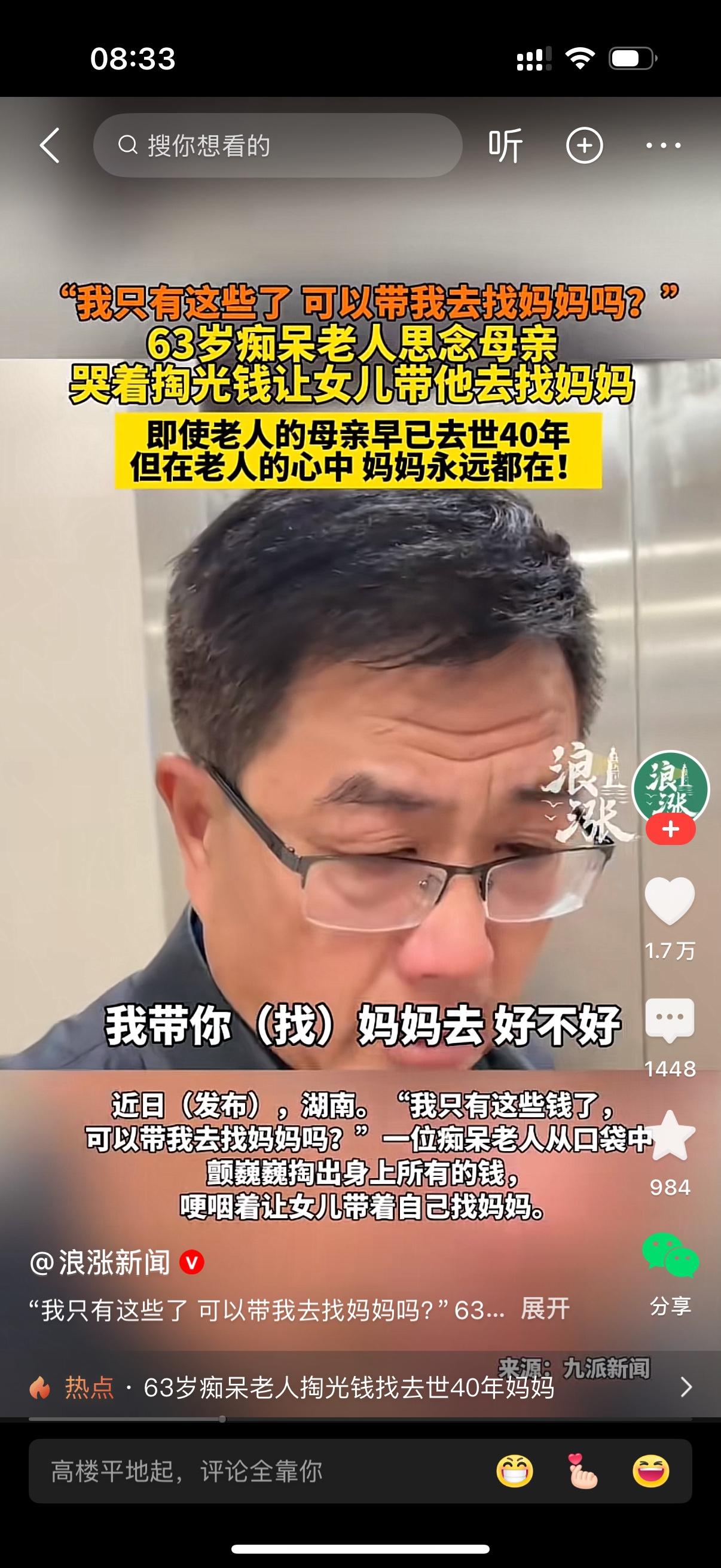 63岁的痴呆老人想念母亲,哭着对女儿说想妈妈了,你带我找妈妈去好不好,我给你钱。说着老人从身上颤颤巍巍掏光钱给到女儿,哽咽着说这还有一块。其实老人的母亲已去世40年,但在老人的心中,妈妈一直都在。女儿看到父亲这样已经泪崩。