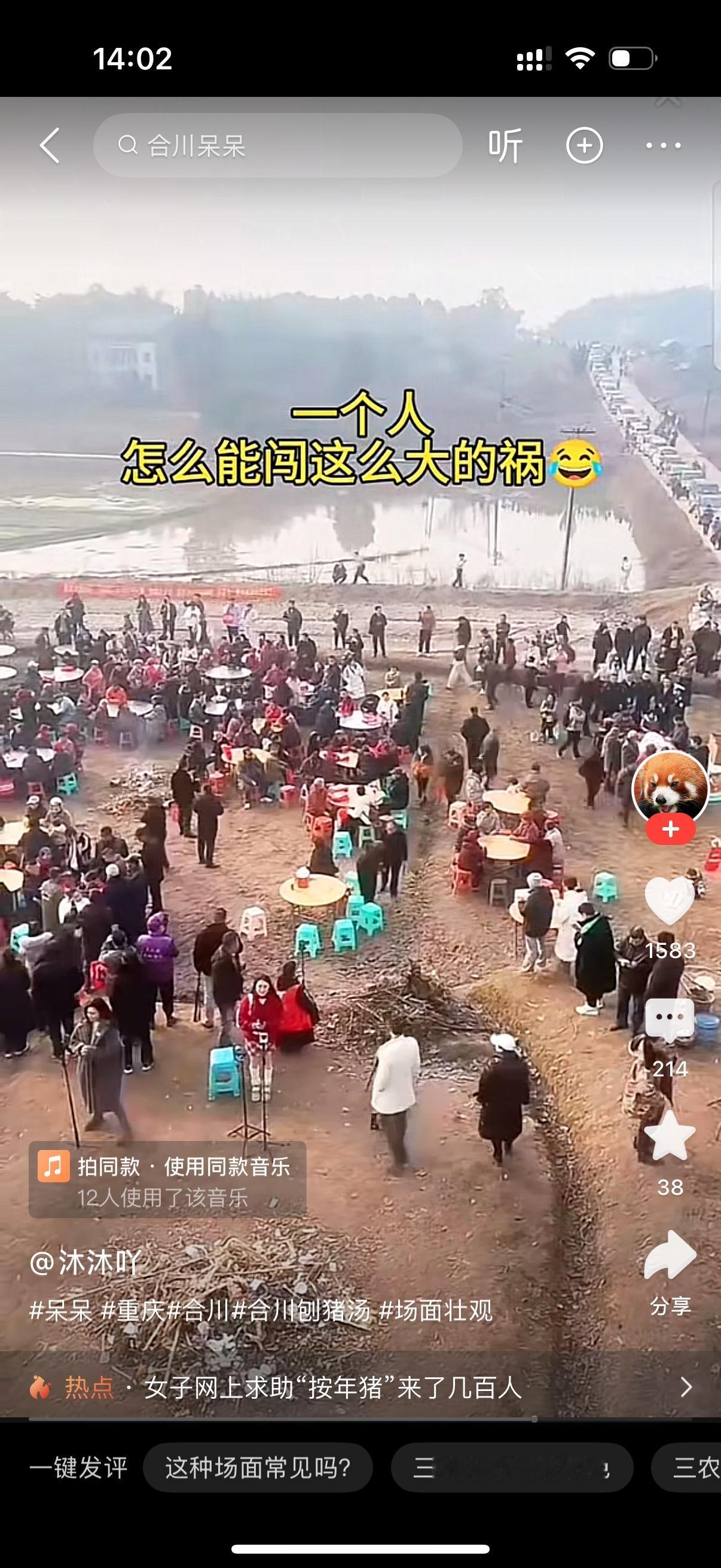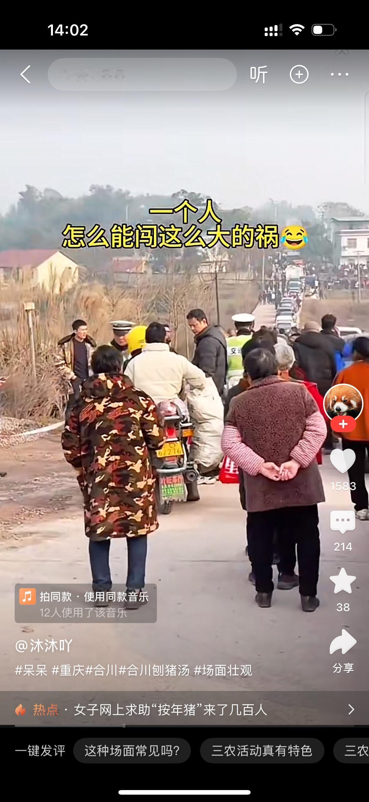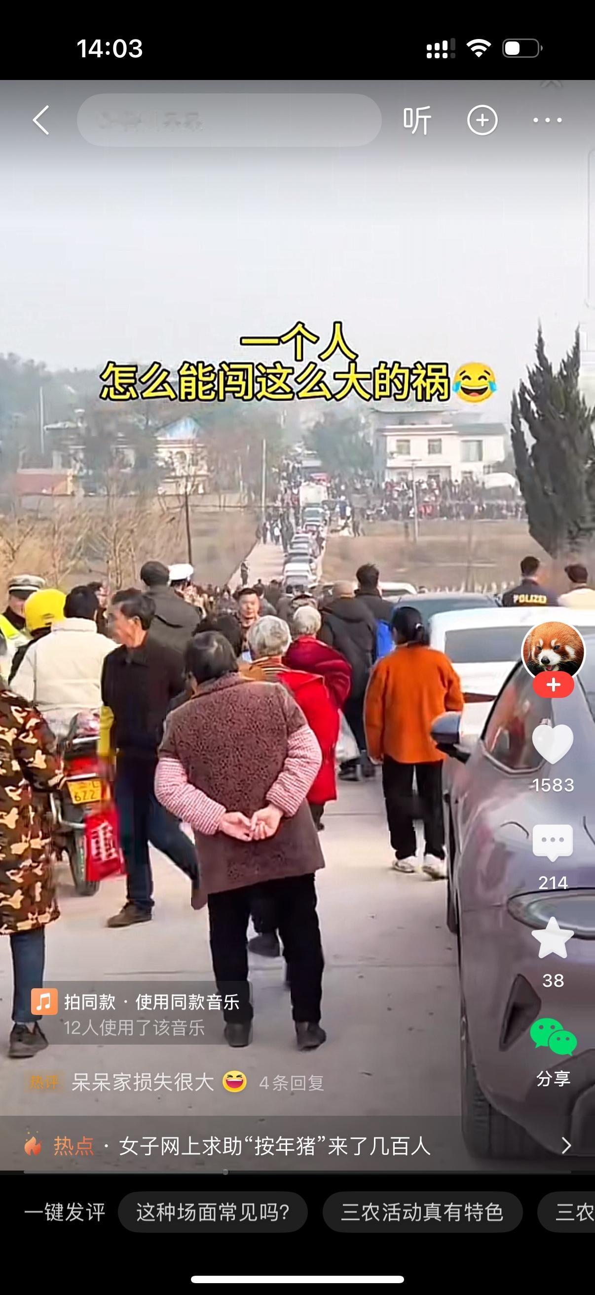 一个叫呆呆的女网红家里要杀年猪,在网上发帖想找几个帮手过来帮下忙,结果太惨了,乌泱泱的全是人。云贵川湘的粉丝都过去了。道路挤得水泄不通,连帽子叔叔都出动了。家里的两头猪根本不够吃,连续摆两天酒席了。这个网红振臂一呼,人全来了,太吓人了。