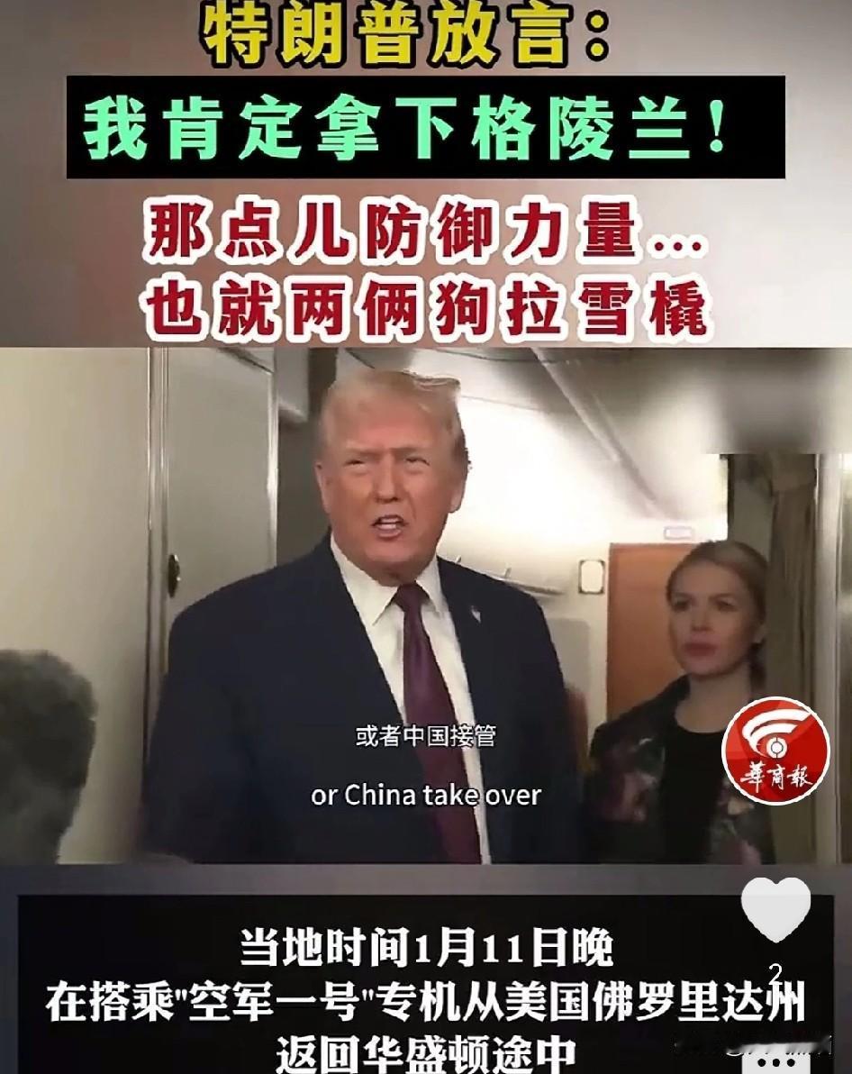 特朗普认为格陵兰岛只靠两架狗拉雪橇守护,因此必须拿下,但不忘记还要扯上中俄。 1月11日,特朗普再次发声,拿下格陵兰岛是必然的,否则让俄罗斯和中国得到就麻烦了。 这也给了丹麦一个提醒,如果想要守住格陵兰岛,最好是把这两个大国给牵扯进来,可以租,也可以卖一部分,总之比拱手让给美国划算。