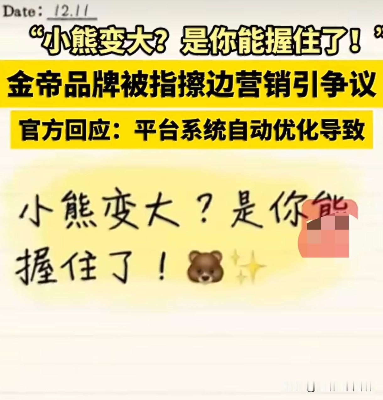 金帝巧克力道歉:怀旧营销的底线,从不是算法说了算 承载80、90后童年记忆的金帝小熊巧克力,因一句“小熊变大?是你能握住了!”陷入擦边争议。 网友吐槽文案低俗不适,质疑品牌借谐音玩梗,这份童年情怀突然变了味。 品牌致歉称是小红书投放的自动优化功能“惹祸”,算法拆分组合出不当大字报,原意是回应尺寸争议。 可算法终究是工具,人工审核的缺位,才让“失误”有了曝光的机会。 怀旧营销的核心是共情,不是无底线蹭流量。大白兔靠联名唤醒甜蜜回忆,北冰洋凭复刻圈粉,都守住了情怀底线。 近年来AI营销翻车频发,从花生上树到恐怖圣诞广告,暴露的都是对“人心”的忽视。 金帝的整改措施很及时,但消费者更在意的是,品牌是否真的把尊重放在首位。 技术可以提升效率,但不能替代责任。算法算得出数据,却算不懂用户的情感边界,更算不清品牌信任的重量。 怀旧是宝贵的情感资产,不是随便消耗的流量密码。用擦边消耗情怀,终究会失去消费者的青睐。 真正的品牌成长,是在流量与底线间找准平衡。希望金帝的这次教训,能让更多品牌明白:营销可以玩创意,但不能没分寸。 情怀值得被珍视,消费者的信任更值得被善待。愿每一份童年回忆,都能被温柔对待,而非沦为争议的导火索。
