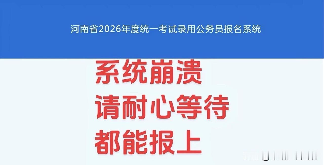 河南省考报名系统崩上热搜:顺延48小时,民生服务该补这堂课 2026年河南省考报名截止日,无数考生卡在“最后一公里”——系统从11日晚就持续崩溃,登录失效、页面卡顿成常态,百万考生刷到崩溃。 官方早于9日预警报名高峰,提醒别掐点,却没守住系统底线。新更换的平台端口不兼容,主流浏览器都报错,技术短板暴露无遗。 考生的崩溃藏着太多无奈:有人备考半年学到凌晨,却栽在报名环节;有人换3种浏览器、4种网络,仍摸不到系统大门。 咨询电话占线,各地市人社部门无力干预,在热搜冲到前五后,官方终于回应,将报名时间顺延48小时至14日17时。 民生服务的底线,是不让努力输给意外。考公关乎无数人前途,提前预判高峰却不做技术扩容,这样的疏漏不该发生。 其他省份已有先例:陕西、湖北曾遇类似问题,要么及时道歉顺延,要么专人对接解决,对比之下更显应急能力差距。 系统崩溃暴露的,是服务意识的缺位。所谓“提醒避峰”,不该成为技术不足的免责声明,更该是提前优化的信号。 真正的便民,是预判问题、备好预案,而非事后补救。省级考试的报名系统,理应经得住压力测试,扛得起公众期待。 官方的顺延决定,总算给了考生公平机会,也展现了正视问题的态度。但民生服务的优化,从来不止于“亡羊补牢”。 长治市曾有82万中标报名系统两天崩溃的教训,警示技术采购不能只看低价,更要守好质量底线。 政务服务的温度,藏在每一次稳定运行里。希望这次风波能成为改进契机,让技术保障跟上民生需求,不让考生的汗水白流。 考公之路本就充满竞争,愿每一份坚持都能被善待,每一次服务都能少点意外,多点安心与靠谱。
