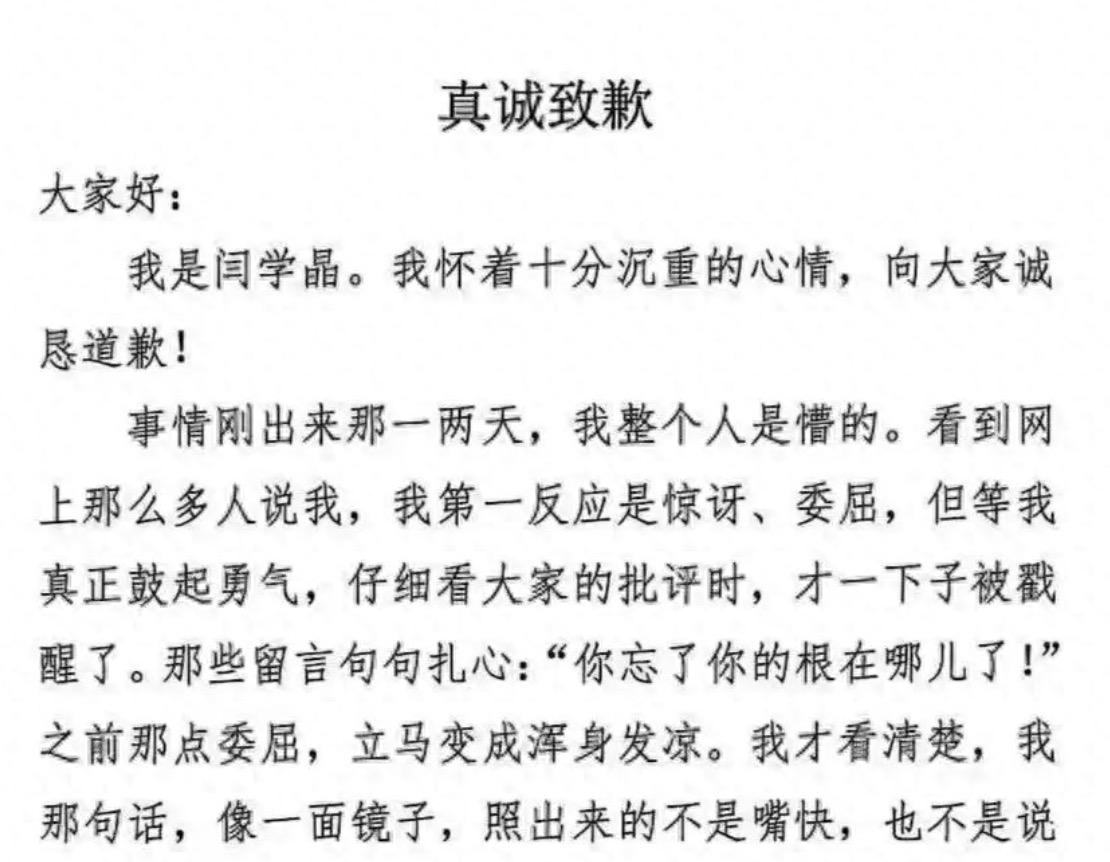 老艺术家闫学晶终于是低下了高昂的头颅,选择了向大众公开道歉了! 就在1月11日晚上,闫学晶发布了道歉信,这个道歉信我也看了,洋洋洒洒足有近千个字,但重点其实只有六个字:对不起我错了。事实上这起事件发酵了这么久了,为何闫学晶突然就道歉了呢?是因为她真的认识到自己的错误了吗?其实还真不见得。之所以她道歉,在我看来其实是两方面的原因。 一方面是因为她的账号,被平台给处理了,这一次被禁止关注,下一次就有可能会是禁言了。 另外一方面是因为矛盾在不断的转移,之前大家只是针对她自己,现在已经开始针对她儿子了,并且有人在举报她儿子入学的问题。而且看对方的架势,有种不达目的不罢休的感觉。这是已经触及到了她的切身利益,除非她以后不想再玩互联网,又或者是她的儿子入学真的没问题,否则她必须要有所表示。 因此在这样的前提之下,哪怕是她再不想要道歉,也都必须要道歉。所以说她这次的道歉,与其说她是认识到了错误,不如说是她怕自己丢了饭碗而已。此外,我相信也有不少的网友觉得,闫学晶其实也是挺冤枉的,她不过就是当众说出了自己的实情而已,为何说实话还要引起大众的反感呢?本质上是因为,她说实话的对象错了。 如果她在自己的圈子里,说出这样的话大家绝对很同情她,甚至说不定还有人会资助她。可她在面对一群不及她十分之一的网友时,她再说出一年几十年不够花销的话时,大家就会感觉到这是一种讽刺,就是在哭穷。我不知道其他人会怎么想,但是当我听到这样的话时,感觉到的就是不舒服。当前的环境到底如何,我想大家应该是深有体会。 我家楼下有两家小馆子,一家已经是关门大吉,门头上招牌也已经去掉了。而另外一家暂时没关,但是却写着转让。而我家隔壁的邻居,她家的男人被单位辞退了,现在找不到工作,只能去跑外卖了。而我经常去的那家理发店,她男人公司破产了,欠下了几十万的债务,被对方起诉成了老赖,房子也被查封了。老家邻居家的孩子大学毕业,找不到工作跟着父亲一块干工地。 所以你说你过得很苦,你说你几十万过不下去,那我们这些每个月工资只有几千块,甚至是连工作都找不到的人呢?我们又苦不苦呢?